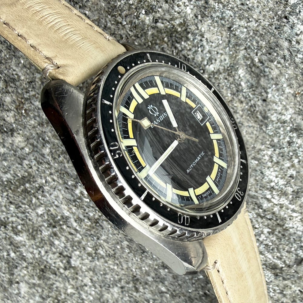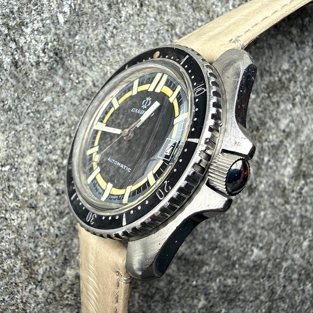 A unique timepiece in original (late seventies) condition. We have seen Candino divers in this Monnin case before, but the configuration on the dial was different. Here the striking yellow dial ring and the full lume hour markers really light up together with the square shaped “lollipop” seconds hand under uv-light. It even has intact lume on the zero dot. The bezel is unidirectional and clicks as it should (the patent Brevet 503.305Â refers to the unidirectional bezel). The dependable ETA 2873 automatic movement is serviced, and the watch is guaranteed for 24 months. The dimensions of the 10726 numbered case are: Diameter 42, height 46.5, lug width 20 and thickness 14.1 mm. We have fitted it with an Italian hand made leather strap in a coffee-beige color.