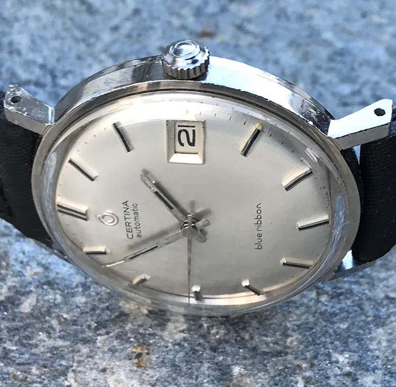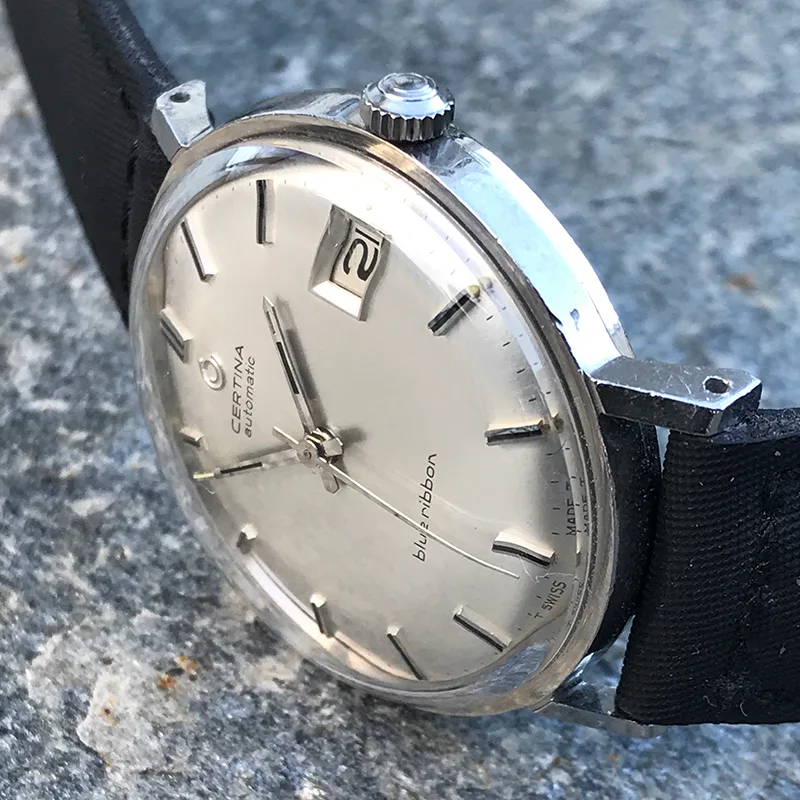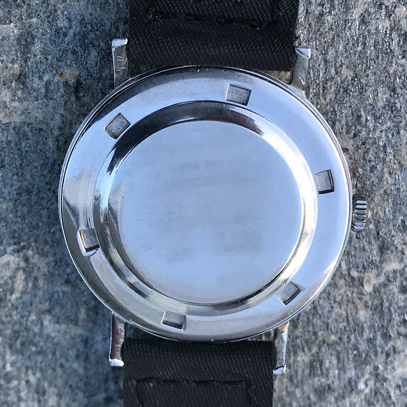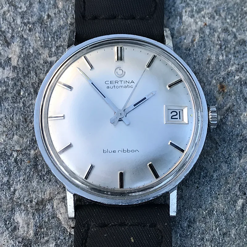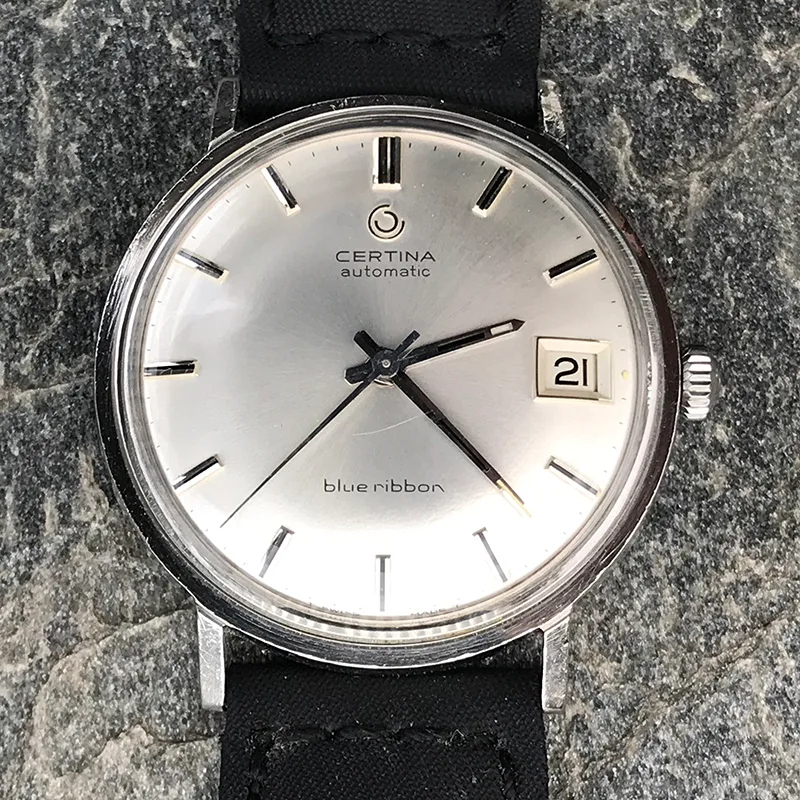 This all steel automatic has the famous 27 jewel 25-651 movement (“25” stands for 25mm diameter). The watch is fully serviced (Sept 2020) and carries a 12 months watchmaker warranty. The condition is good (8 out of 10 – some scratches on the case and lume missing from the hour hand). Here you find the super classic, most sought after combination of materials: White gold applied indexes with black onyx inserts, and a curved dial giving beautiful reflections of light from the silver dial. The case diameter is 34,3mm and we date it to ca 1965. Please ask for pictures and details of other variations on the “Blue Ribbon” range. We usually carry at least 3 in our stock.