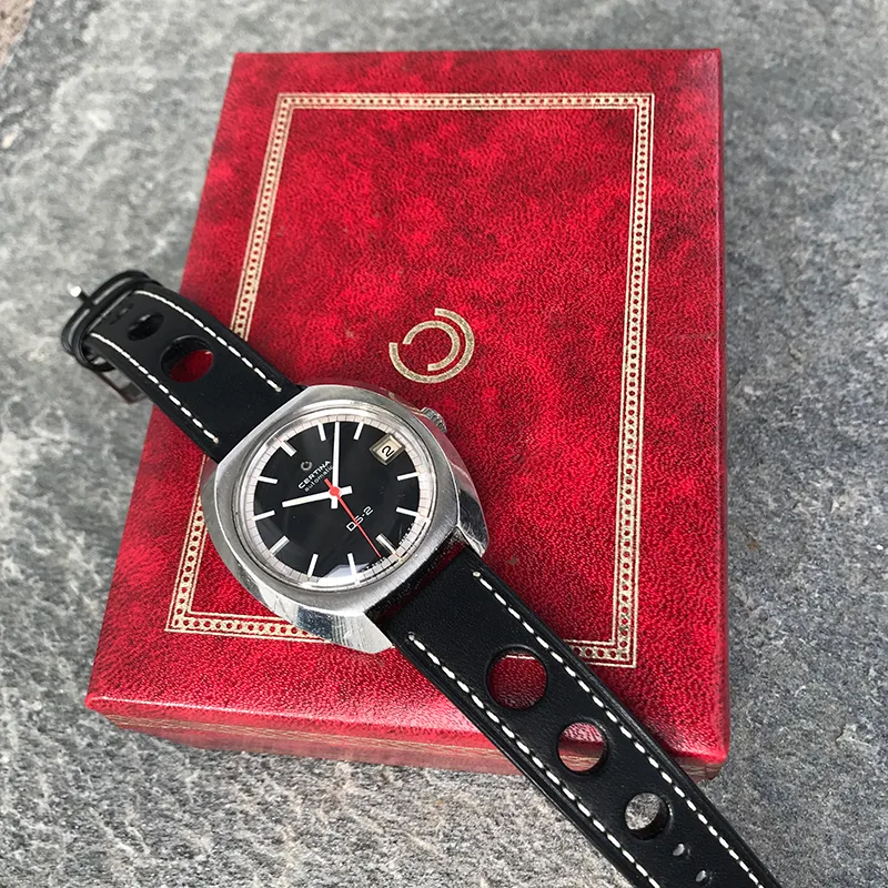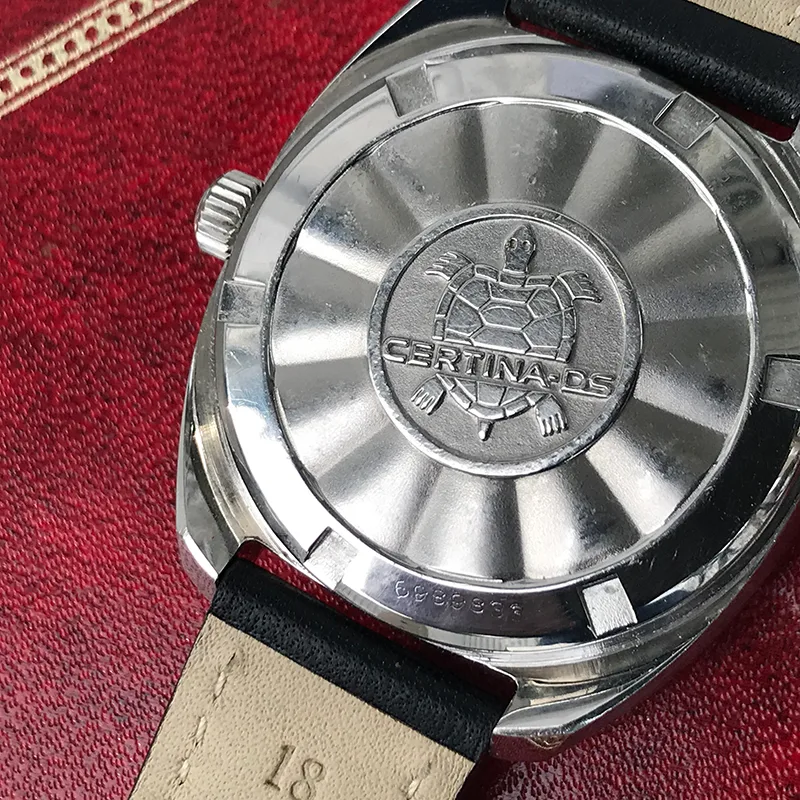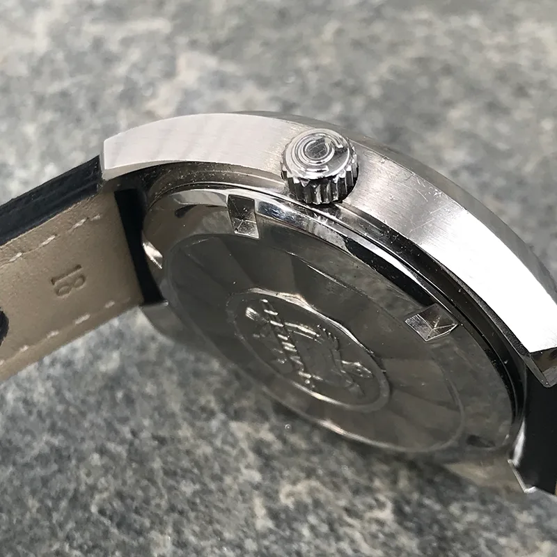 It has the marvelous turtle and waves caseback (the manual DS-2s have a slimmer case, showing only the turtle medallion by itself). The DS-2 cases have a prominent form, and measure 37,5 mm across (40mm if you measure diagonally from ten past- to twenty to the hour). The serial number 6989833 dates this watch to ca 1967, thereby making it an early DS-2. We have equipped the watch with a new “racing” strap.