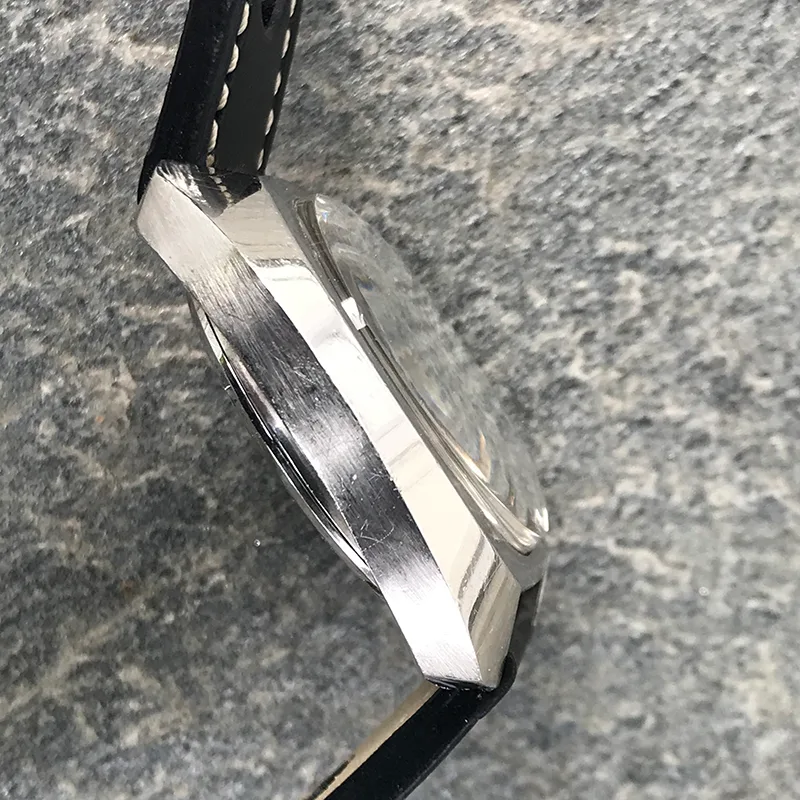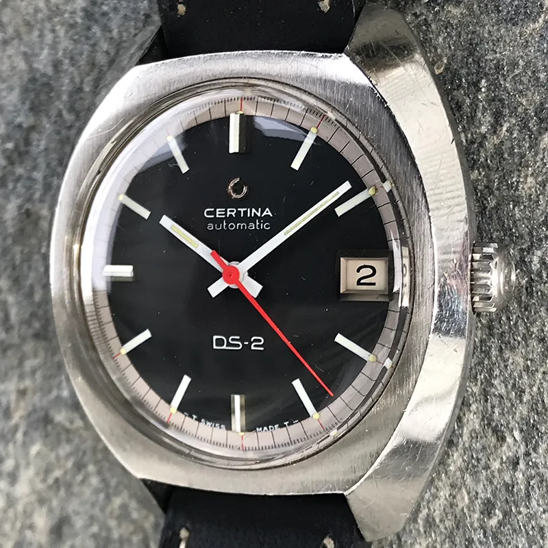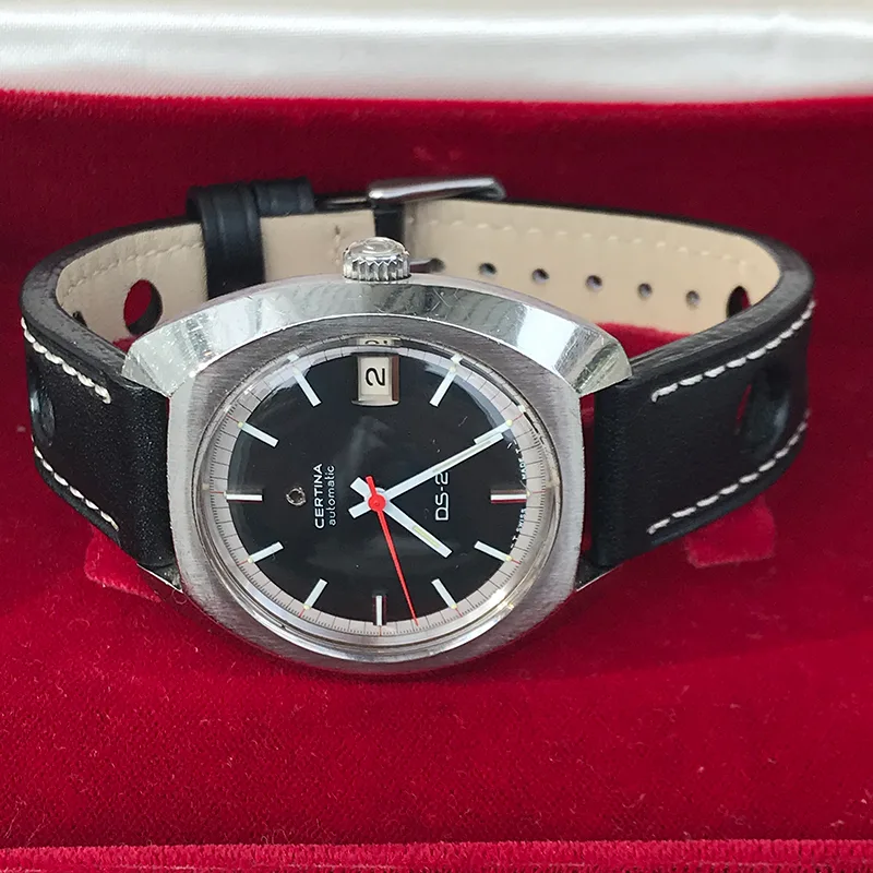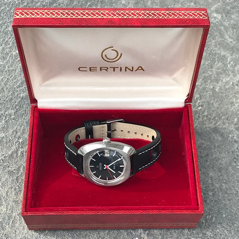 Very nice black dialed all steel automatic with the famous 25-651 26 jewel movement. This DS-2 dial is especially attractive with it’s white internal “bezel”, giving the watch a “racing” image. It (the dial) has the appearance of a NOS watch. All luminescence material is intact on both dial and hands, and the red seconds hand is a super detail together with the white hands and hour markers. The Certina logo and the quarterly hour markers are applied metal (white gold?) together with the frame on the date window. The case bear some marks, but take note: it is not, and should not be, polished. Steel watches are very solid, and the marks they get through their life are marks of history. In this instance it goes to show that the “DS” marking (double security) has proved itself over time.