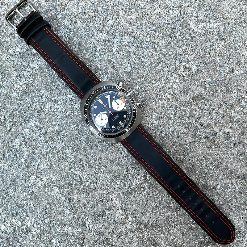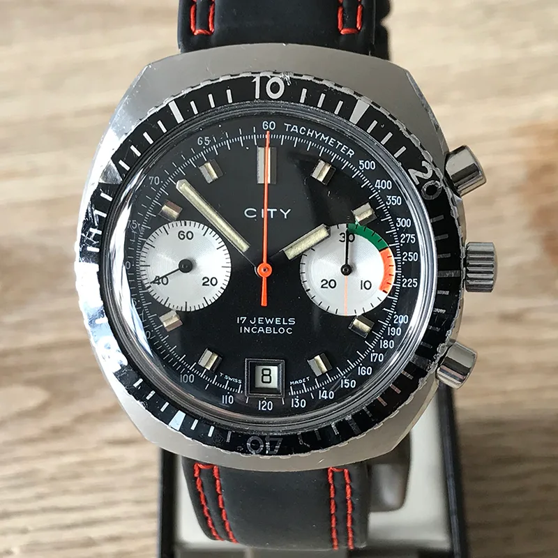 City is the somewhat strange brand name chosen by Swedish importers of Swiss watches in the sixties and seventies. This chronograph is in very nice condition, having an impeccable dial with applied hour markers and nice large silver subdials. A vintage divers-/drivers-/yachting toolwatch for sports use. The colored 5-minute sectors is an indication of a seventies chronograph, many of the earlier ones more usually having  3 minute “telephone” periods on the right hand subdial. These 5 minute sectors are the reason for it to be classified as a yacht timer too, as there are 5 minute countdown periods to time before crossing the starting line. The inside tachymeter scale is for measuring units per hour and was typically the method applied for determining average speed on motorways with mile- or kilometer posts. Under ultra violet light, the zero point on the bezel, all three hands, the hour markers and the right subdial shows intact lume.