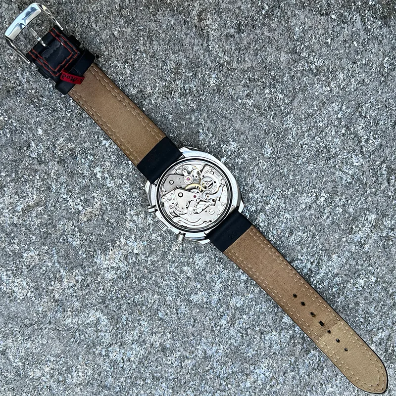 The unpolished discretely cushion shaped stainless steel case is in good order too. Case dimensions are 39 x 43,5 x 13,7 mm, lug width is 19 mm. The beautiful Valjoux 7734 movement works perfectly, running within +/- 15 seconds per day, maintaining more than 200 in amplitude even when the chronograph is engaged and over 250 when not. Because we have not seen any need to service it, the price is in our opinion very attractive for the collector buying this rare “all inclusive” vintage chronograph.