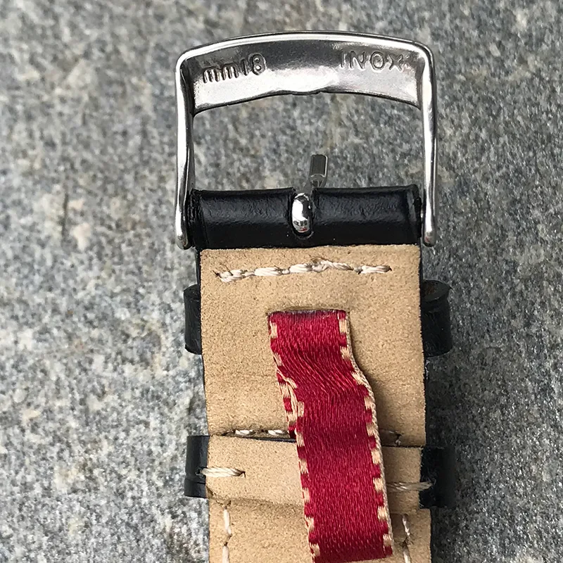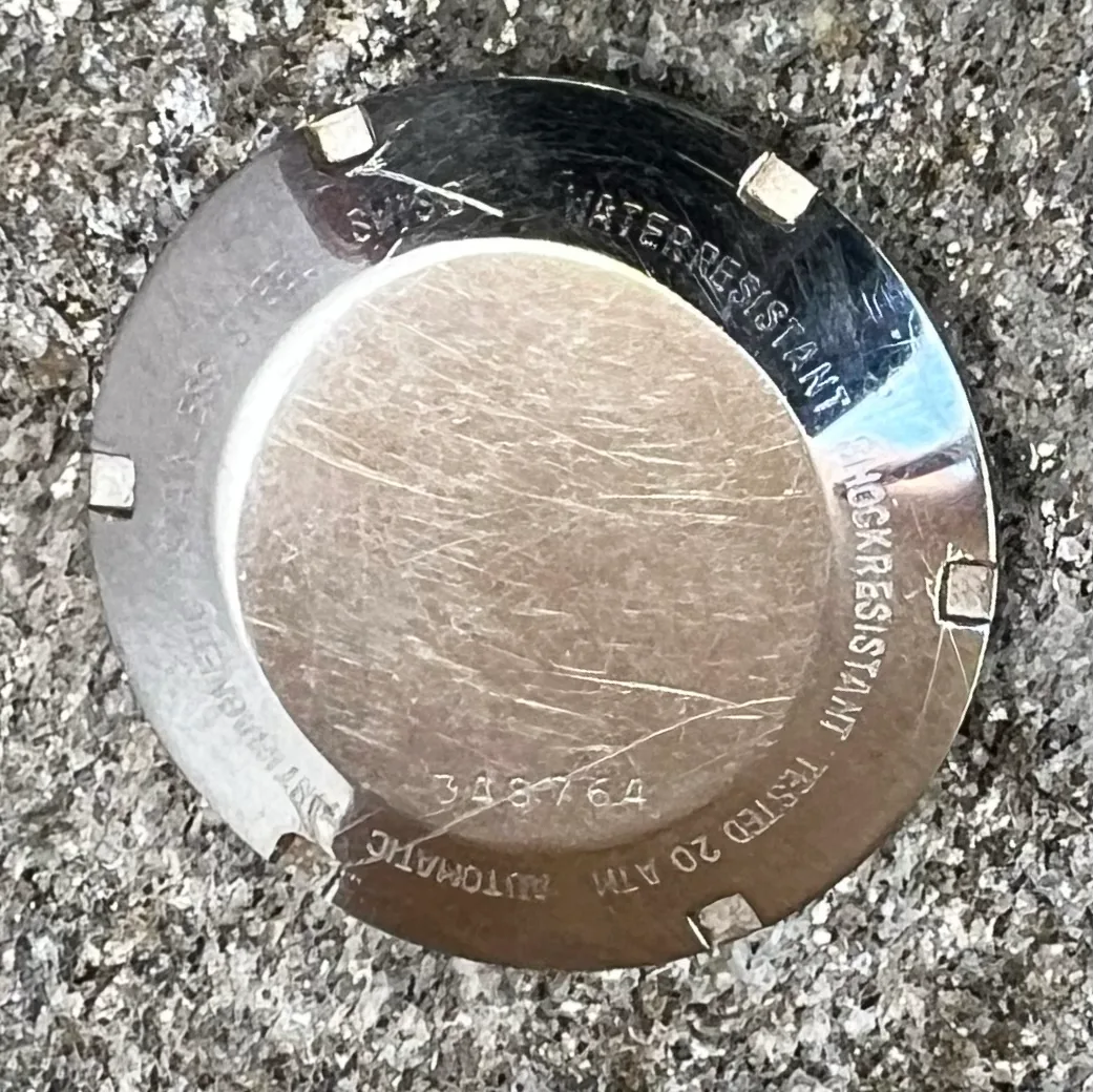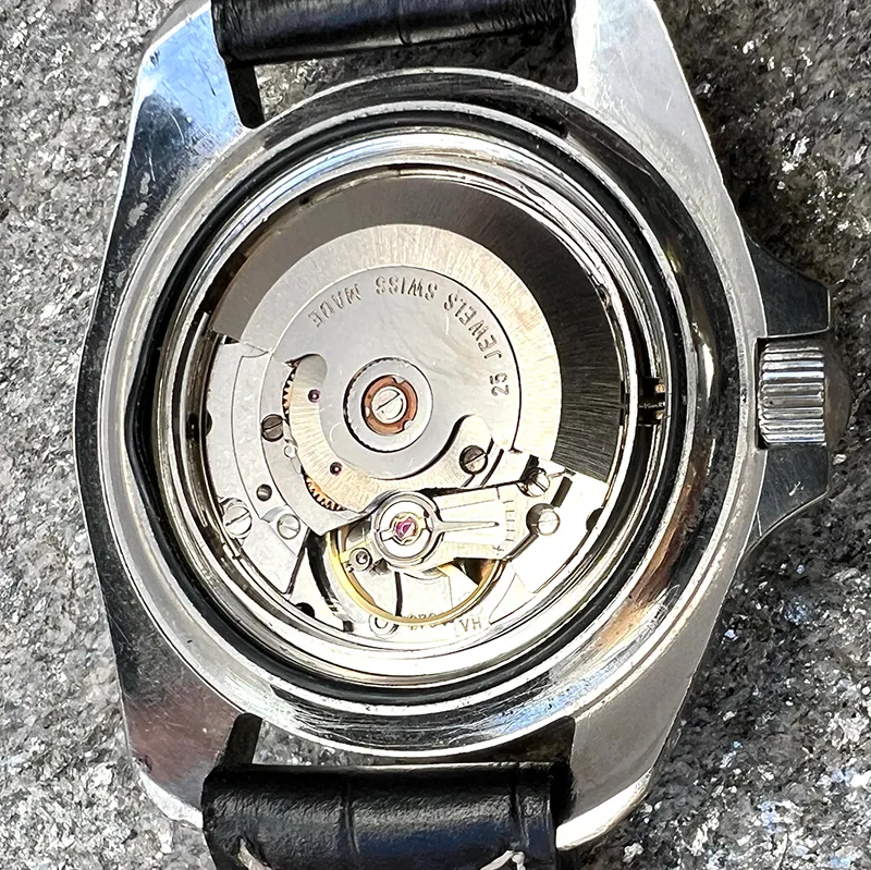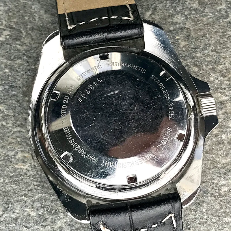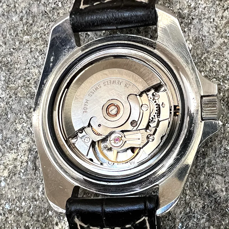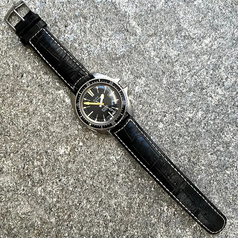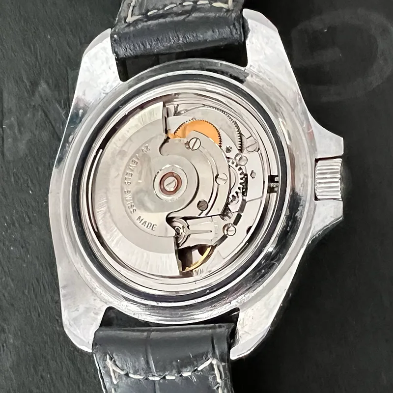 This watch is in very good condition. It has seen little hard use, and keeps accurate time with its high beat (28800) movement. The bezel is worth special mention: It is narrower than many, but has steel numbers and accents cast in a bakelite (?) resin. The usual “dot” is luminescent and also well protected in the same resin.  This watch has been fully serviced by our watchmaker.
