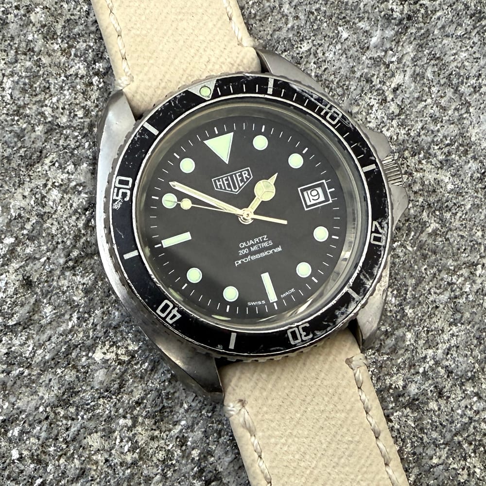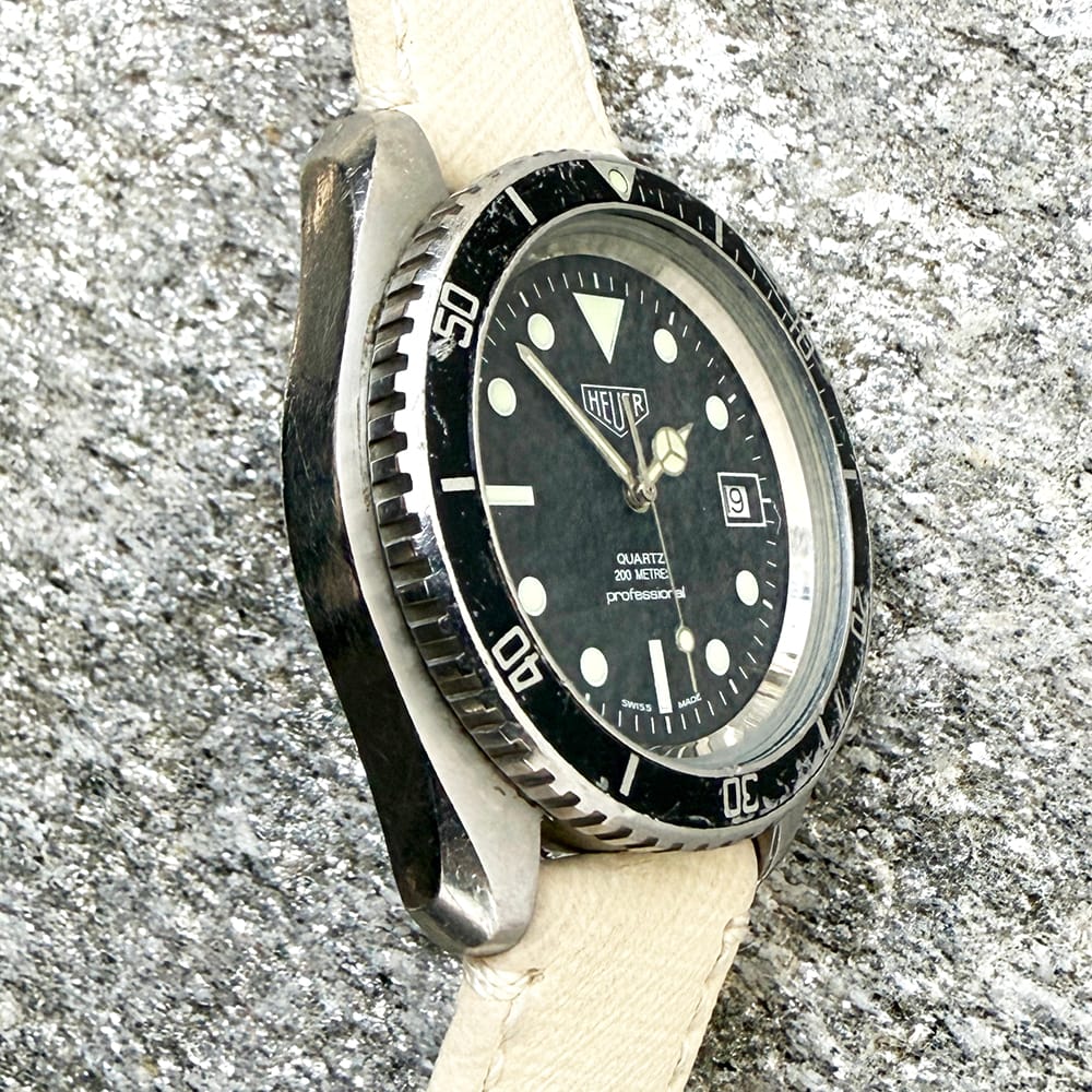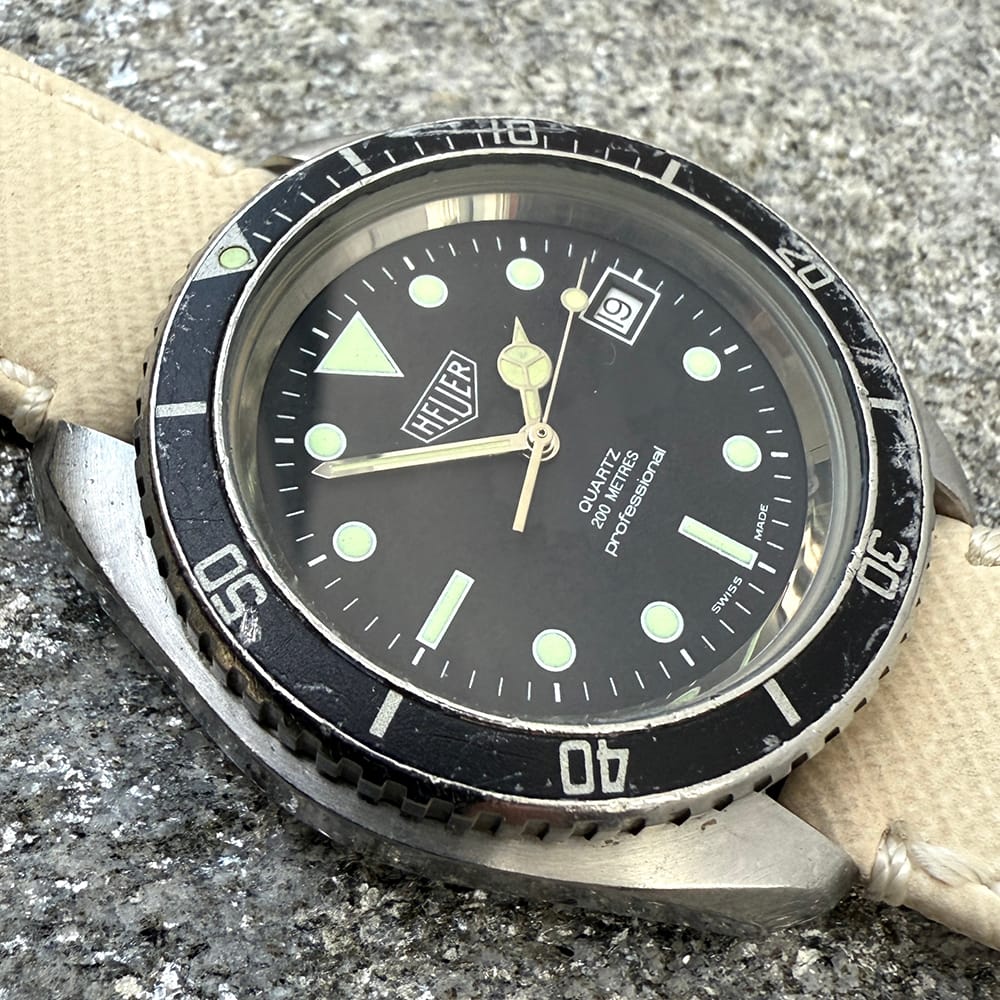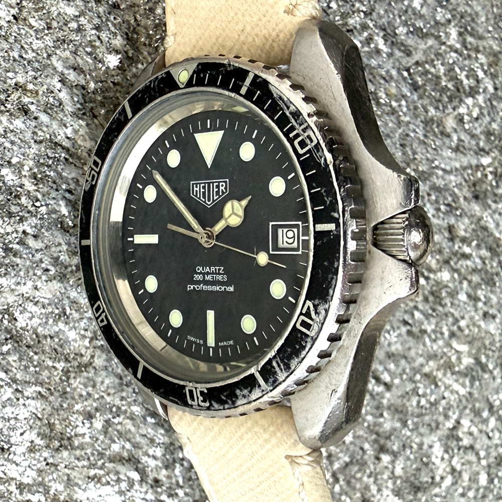 Heuer divers were an instant success. The range was introduced in the late 1970s with automatic ETA movements, although most models became quartz driven around 1980. Several producers used this 42 mm French MRP “Monnin” cases, but the ones signed Heuer are probably the most desirable. And, such is also our experience. The “Mercedes” hands on this example are perfect and the crystal is scratch free. The bezel has wear, but it only adds to the charm of the “Professional 200 Metres” diver. The tritium dot at 12 is intact, and lights up splendidly as can be seen from the photo taken under ultra violet (UV) light. The movement is checked and runs accurately with a new battery. This is a vintage diver you can be proud to have and use.