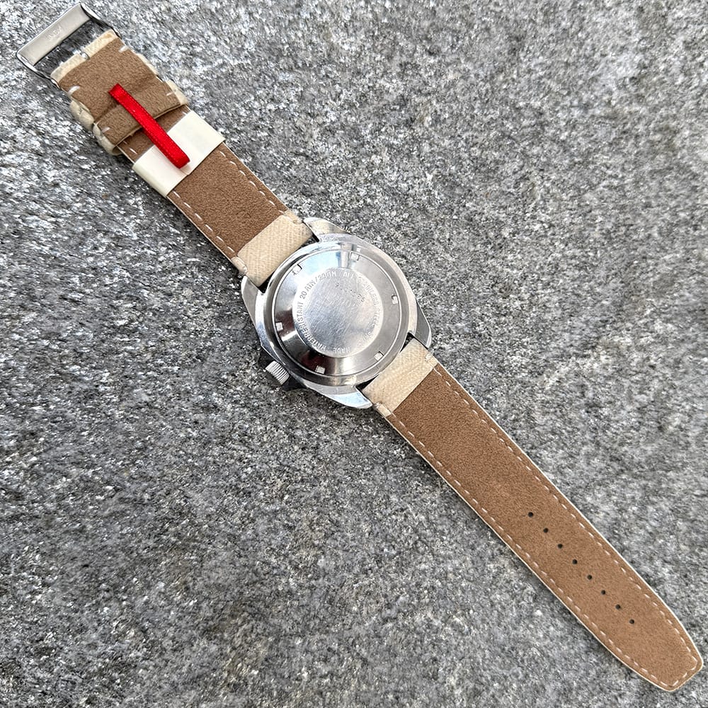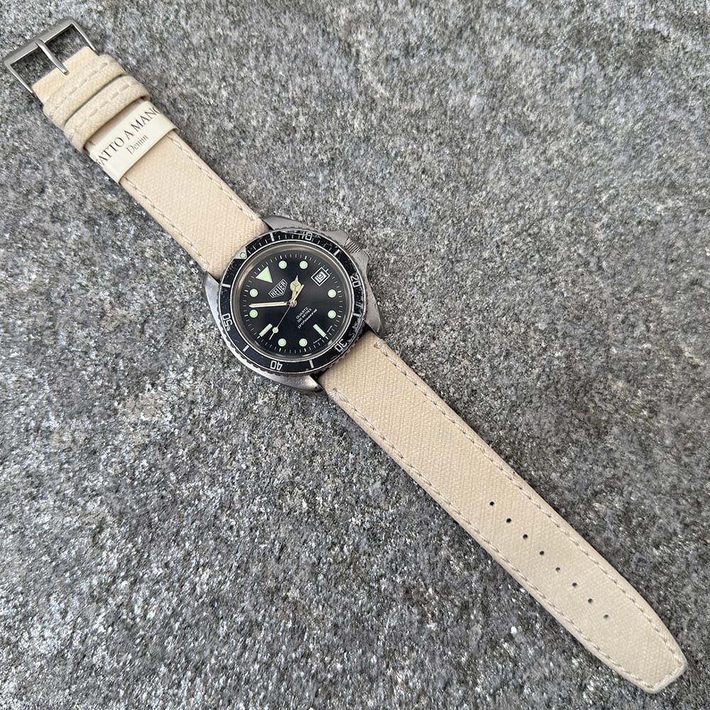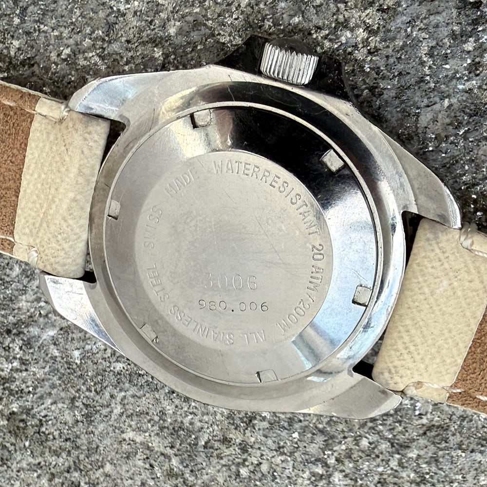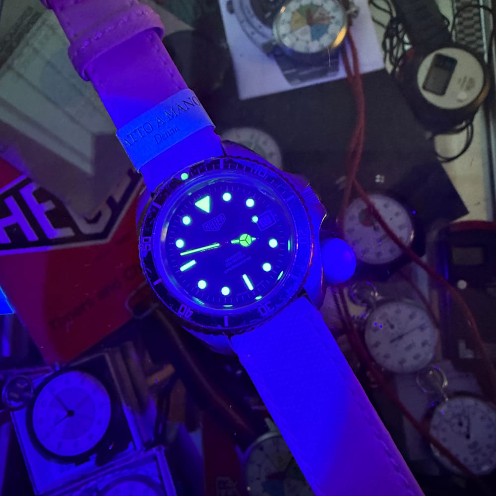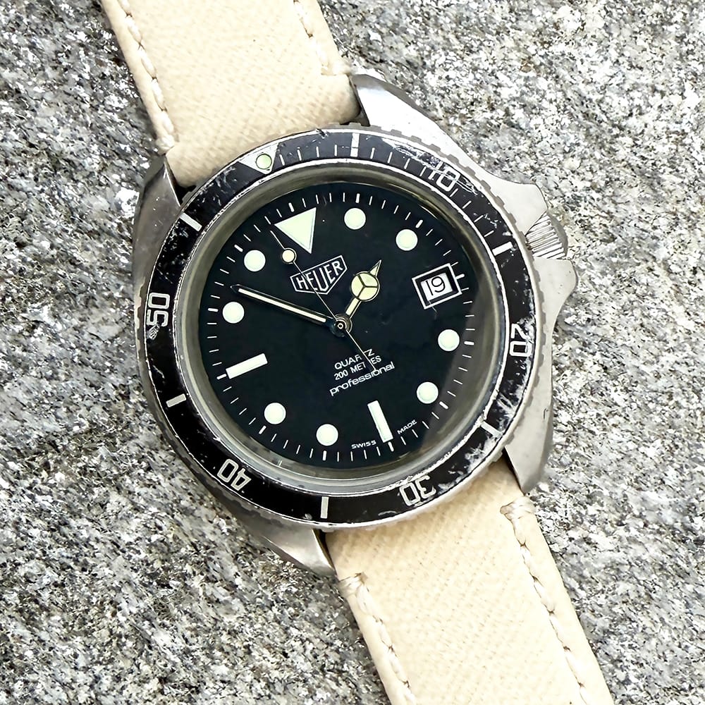 Heuer divers were an instant success. The range was introduced in the late 1970s with automatic ETA movements, although most models became quartz driven around 1980. Several producers used this 42 mm French MRP “Monnin” cases, but the ones signed Heuer are probably the most desirable. And, such is also our experience. The “Mercedes” hands on this example are perfect and the crystal is scratch free. The bezel has wear, but it only adds to the charm of the “Professional 200 Metres” diver. The tritium dot at 12 is intact, and lights up splendidly as can be seen from the photo taken under ultra violet (UV) light. The movement is checked and runs accurately with a new battery. This is a vintage diver you can be proud to have and use.