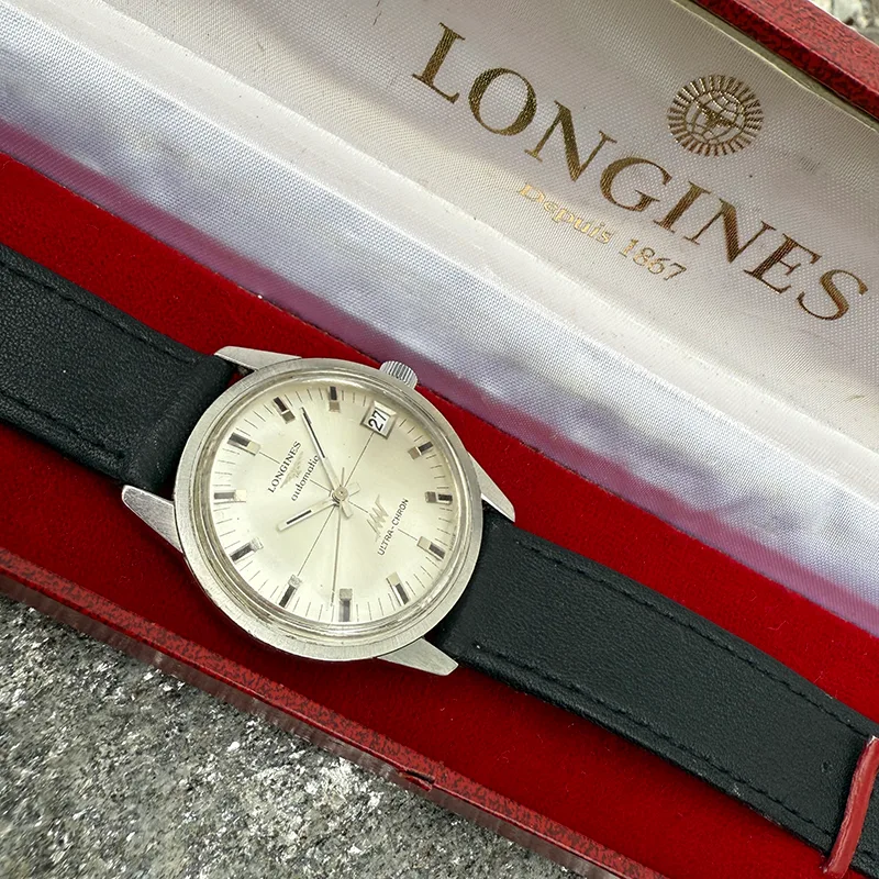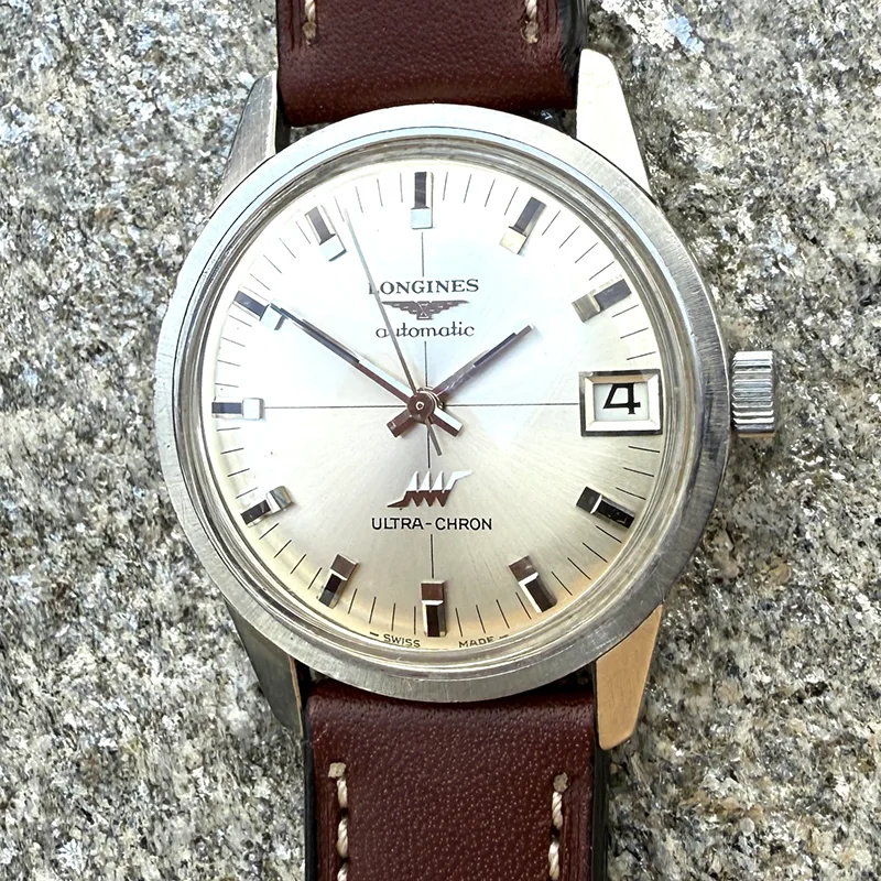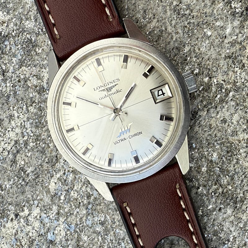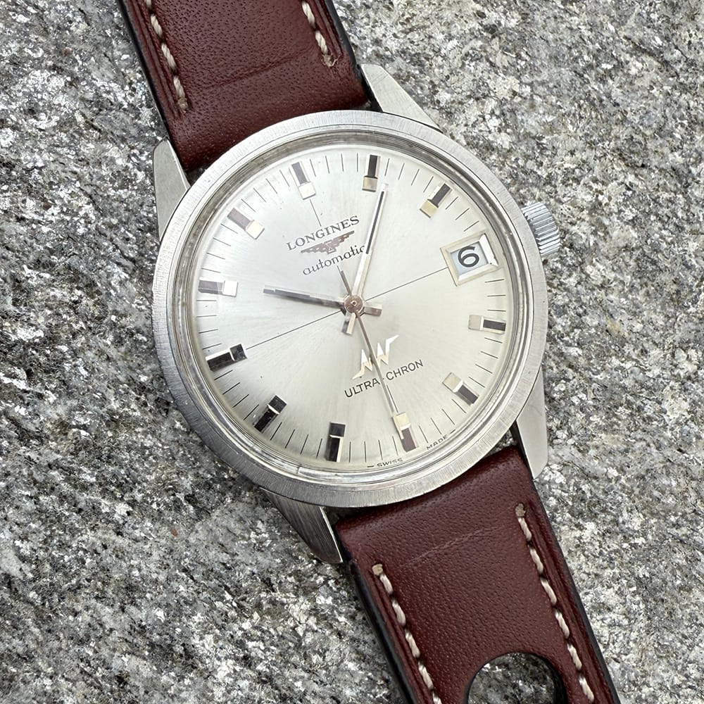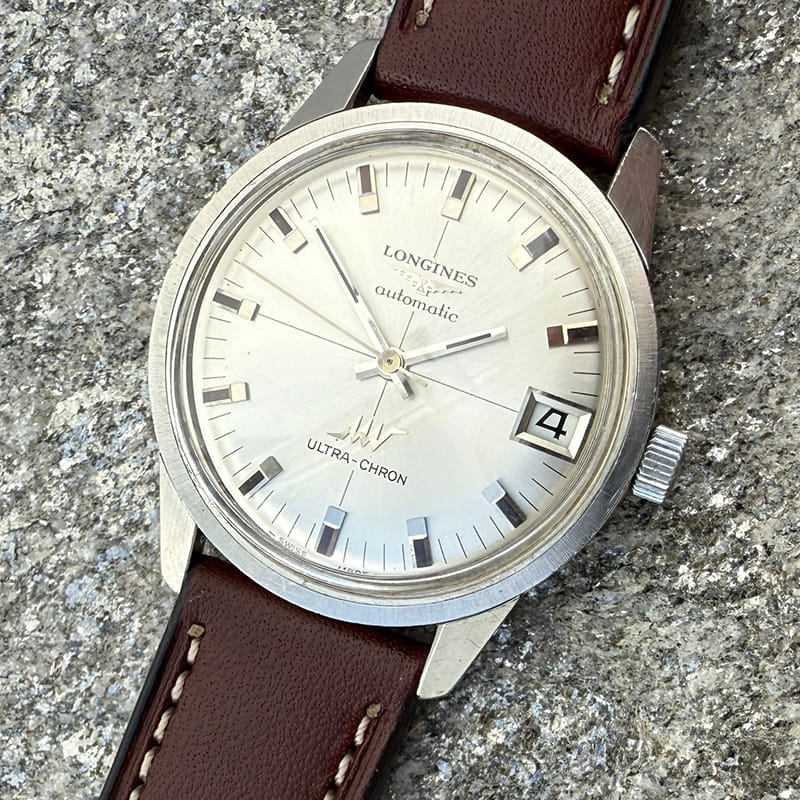 Our old watchmaker told us in the early 1980s that these Longines high beat movements were the finest he had seen in his career. According to the ads from the late sixties when the Ultra-Chron movements were introduced, Longines labelled them “the most accurate watch in the world”. Supposedly accurate to only one second/month. Both an example of the said advertissement and the reference to price of a similar watch restored by Longines themselves are represented among the pictures included. The silvered, cross-haired, no lume dial is very near perfect, as are the hands and the white gold applied indexes. (The Longines and Ultra-Chron logos are also in white gold and applied together with the date window frame). The case is unpolished, with the back showing little wear. The reference number stamped is 15/617964. The crown has been replaced. The movement has not been opened or serviced by us, but the watch runs fine and carries our 12 month guarantee. The case dimensions are: Diameter 34,5, length lug tip to lug tip 40,5 and the thickness is 10,5 mm. We find the brown racing strap with the stainless steel buckle to be a good match, but you can choose another strap if you so please. We date this watch to ca 1969.