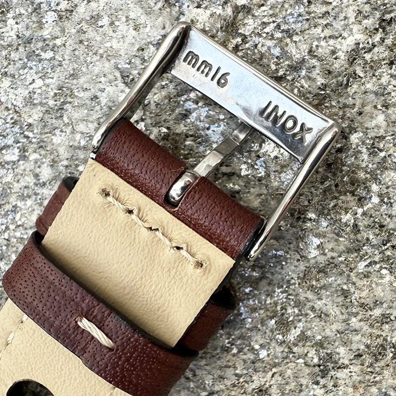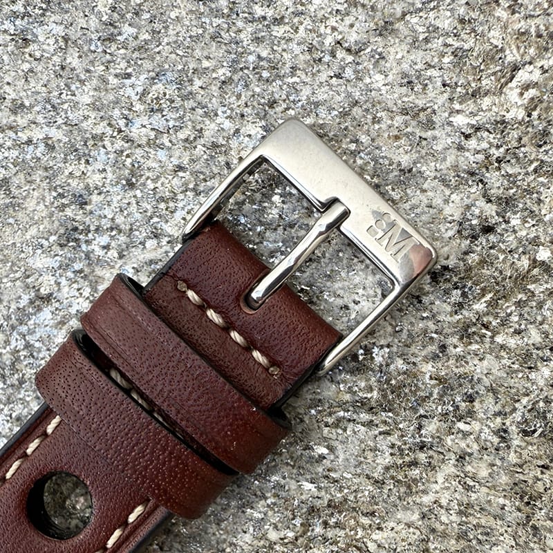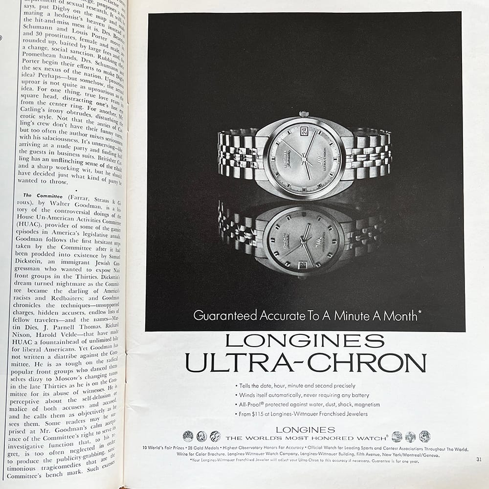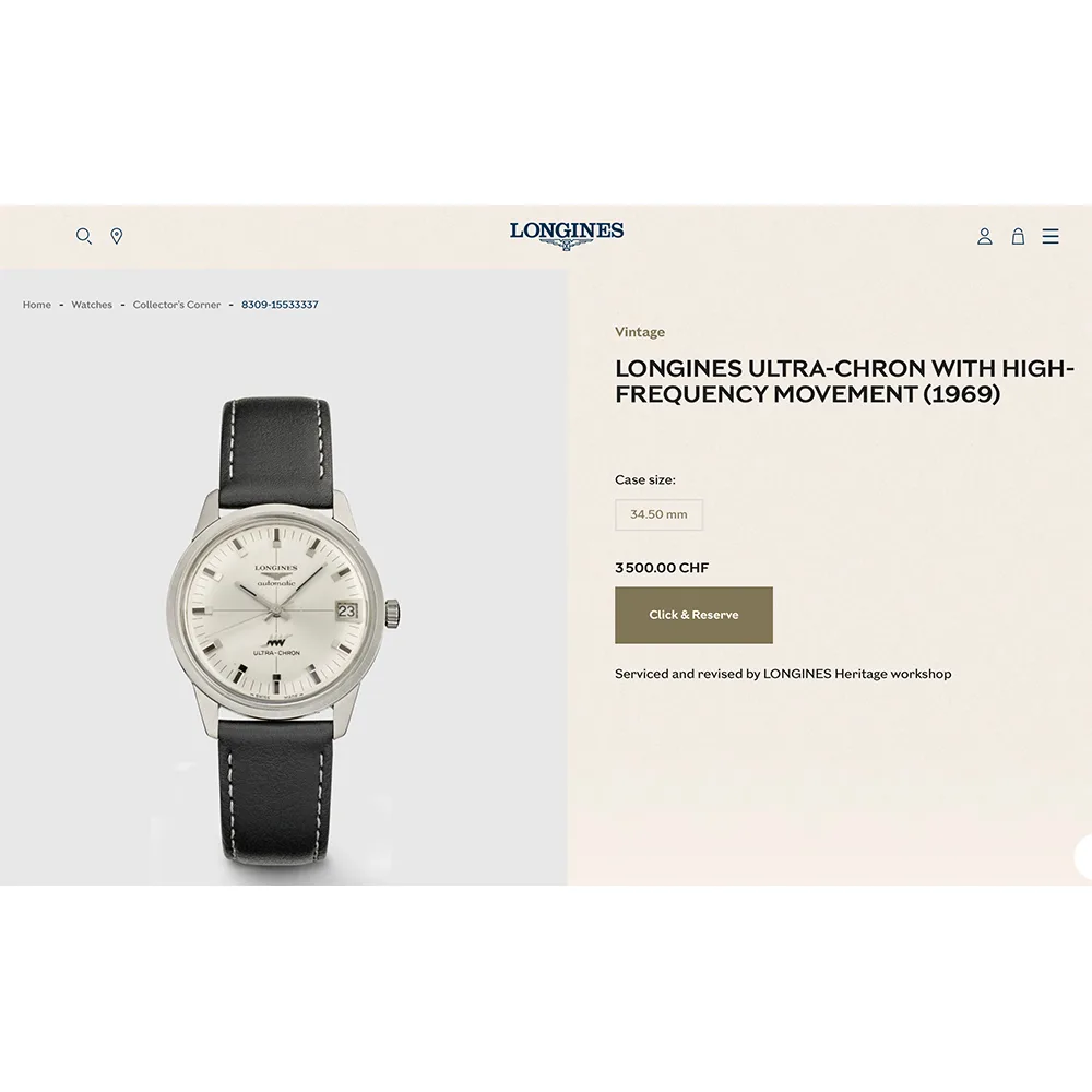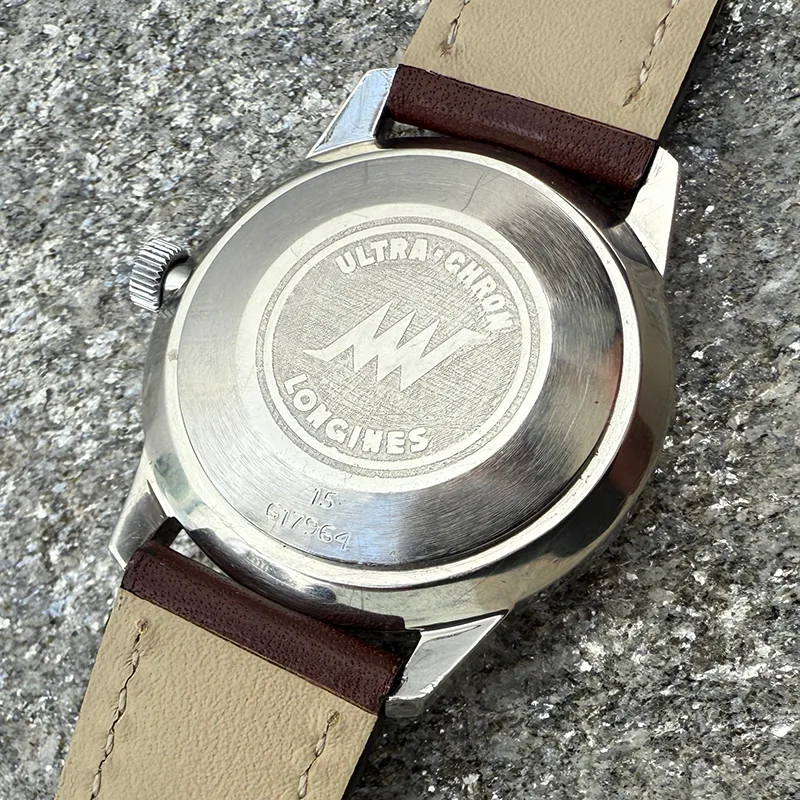 Our old watchmaker told us in the early 1980s that these Longines high beat movements were the finest he had seen in his career. According to the ads from the late sixties when the Ultra-Chron movements were introduced, Longines labelled them “the most accurate watch in the world”. Supposedly accurate to only one second/month. Both an example of the said advertissement and the reference to price of a similar watch restored by Longines themselves are represented among the pictures included. The silvered, cross-haired, no lume dial is very near perfect, as are the hands and the white gold applied indexes. (The Longines and Ultra-Chron logos are also in white gold and applied together with the date window frame). The case is unpolished, with the back showing little wear. The reference number stamped is 15/617964. The crown has been replaced. The movement has not been opened or serviced by us, but the watch runs fine and carries our 12 month guarantee. The case dimensions are: Diameter 34,5, length lug tip to lug tip 40,5 and the thickness is 10,5 mm. We find the brown racing strap with the stainless steel buckle to be a good match, but you can choose another strap if you so please. We date this watch to ca 1969.
