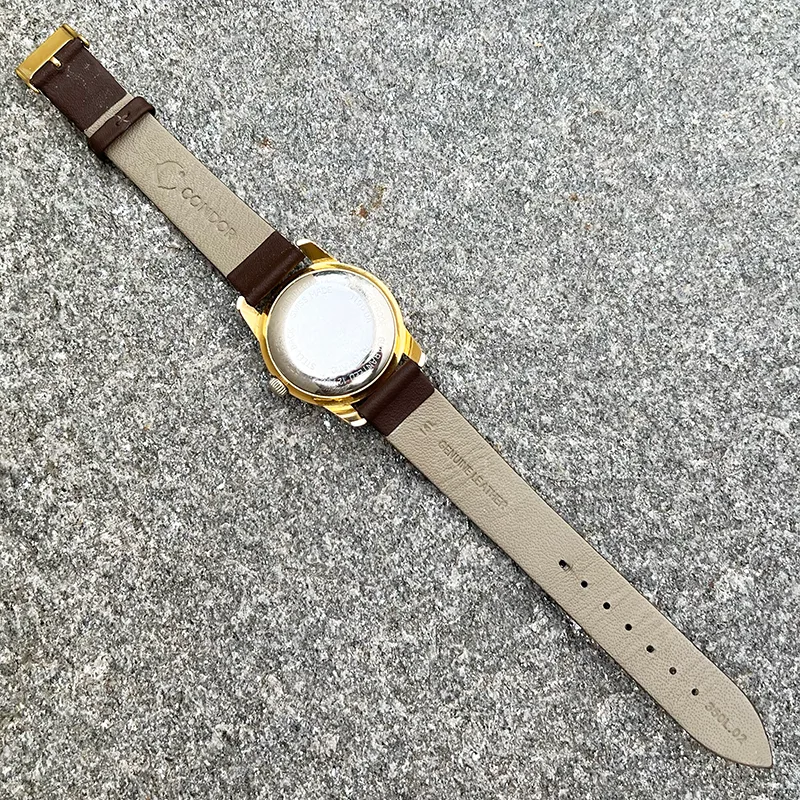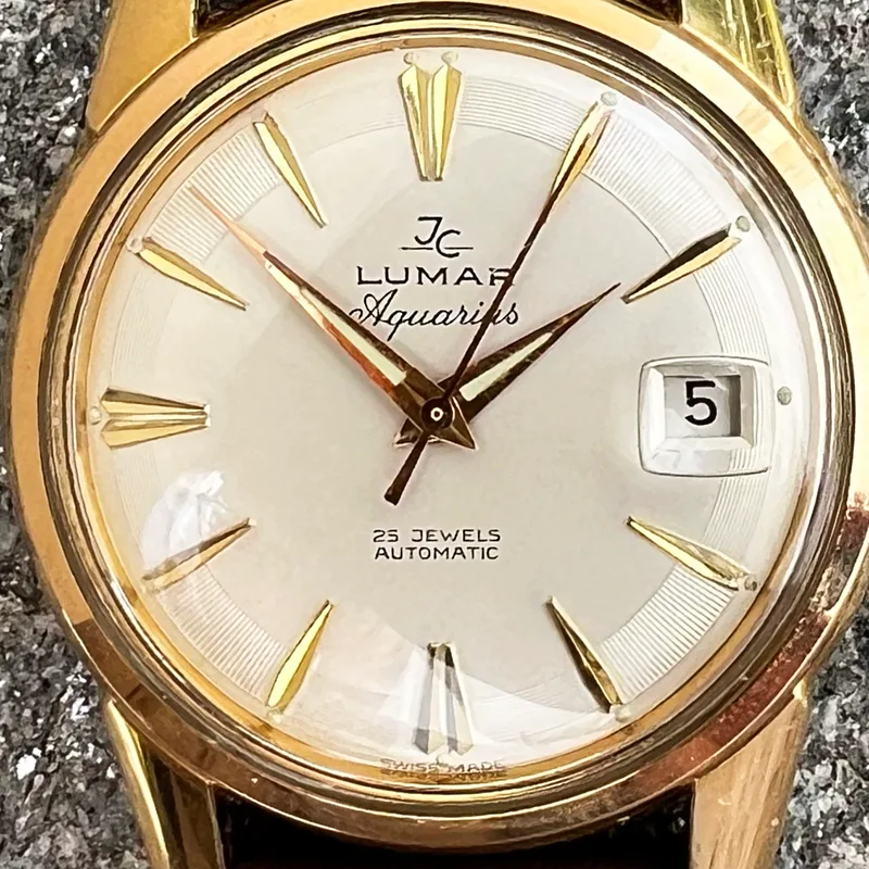 This is an early, somewhat mysterious compressor cased, waterproof to 12 atmospheres, sports watch. Mysterious because the name on the dial appears to be an independent importer of Swiss watches having made an order for his local market. It is therefore rare, and rare also because it is in such good shape. The logo on the crown can point to the manufacturer named ONSA. The dial and hands points to a date around 1960. The watch has a very nice detailed  dial with elaborate hour markers, nice hands and intact lume. The compact gold plated stainless steel case is 36 mm in diameter, with a long (44,4 mm) stretch from lug tip to lug tip and a thickness of 11,3 mm. Internally it is driven by a good quality automatic ETA 2454 movement that has been fully serviced. The cyclop over the date window means in our opinion that the crystal is the original one. In short another intriguing vintage that will serve as a conversation piece with watch interested friends!