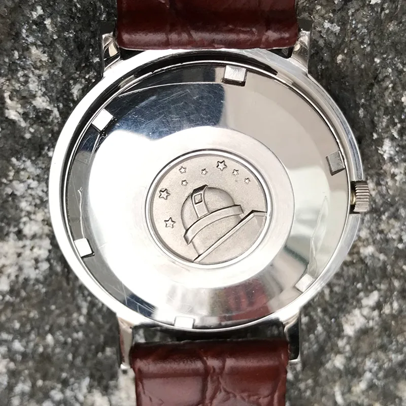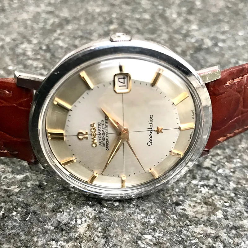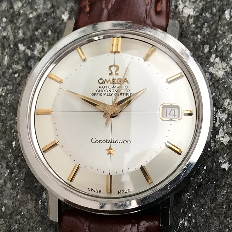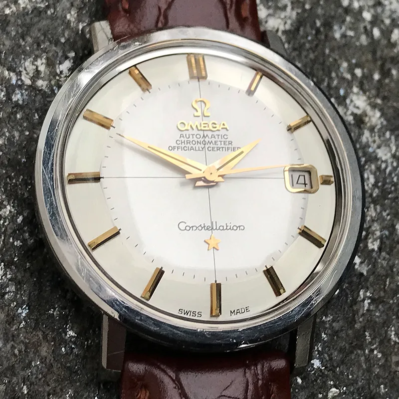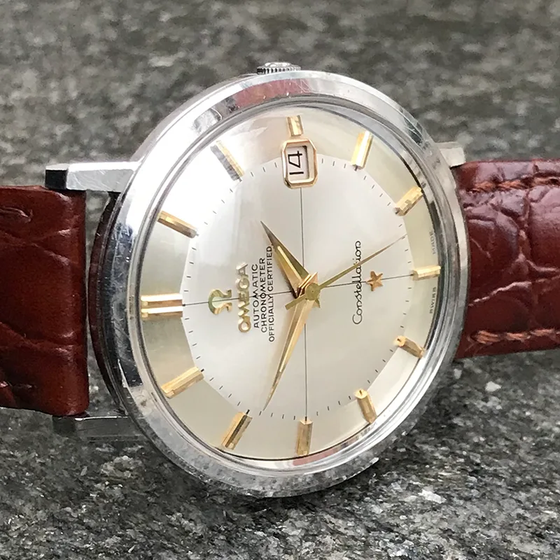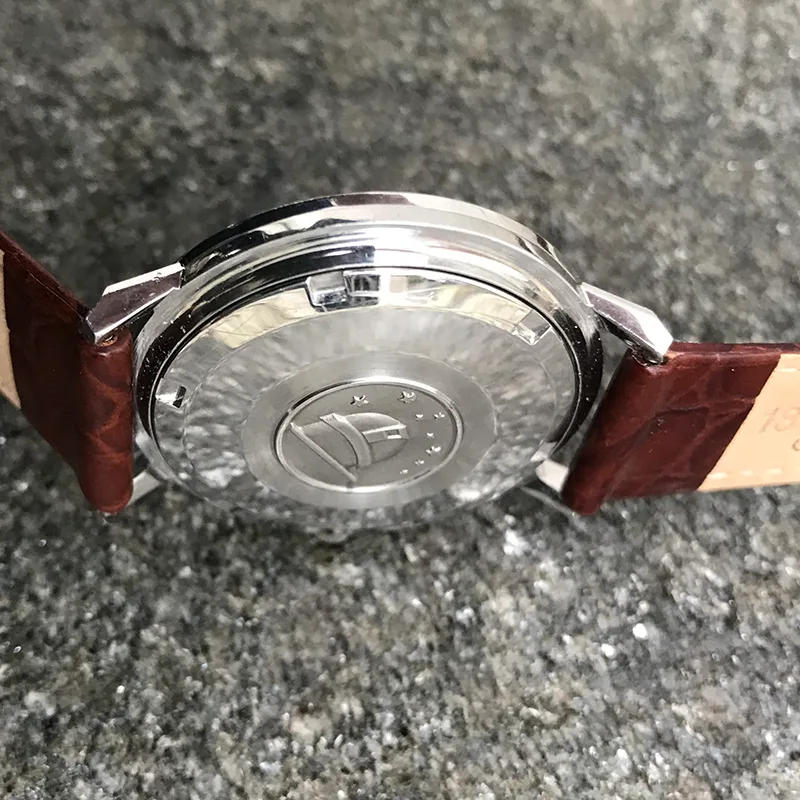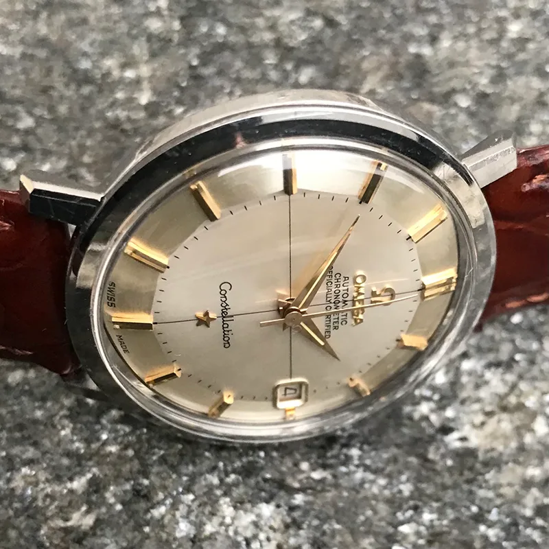 Oversized vintage Constellations (35,6 mm) are quite rare. The extra 1,6 mm matters, as you can see from the pictures where we show this reference next to the more common “dog legged” 160.005 model that sports a diameter of 34 mm. Many Constellations have had a long active life, and will invariably show significant wear. Here is the first thing to check (after you have inspected the dial): look for the gold medallion on the back cover, and count the 8 stars. When you have located all 8, start to evaluate the wear on them, and the observatory. This specific and super Constellation 168.004 has no wear on the medallion because it has not been used for many of it’s 60 years and because the back cover is all steel. We prefer this, simply because a “flat” (worn) gold medallion is unattractive to us. In addition, the cross hairs piepan dial, hands and applied gold details on this Constellation are perfect (a superthin hairline stripe on the dial between 12 and 1 is the exception). Quite unaffected by the years that have passed since it left the Omega factory, the visuals of this watch are hard to match. The caliber 561 automatic chronometer movement has been fully serviced. The watch has serial number 20391444 dating it to 1963, and the case manufacturer is SGR.