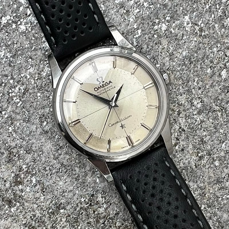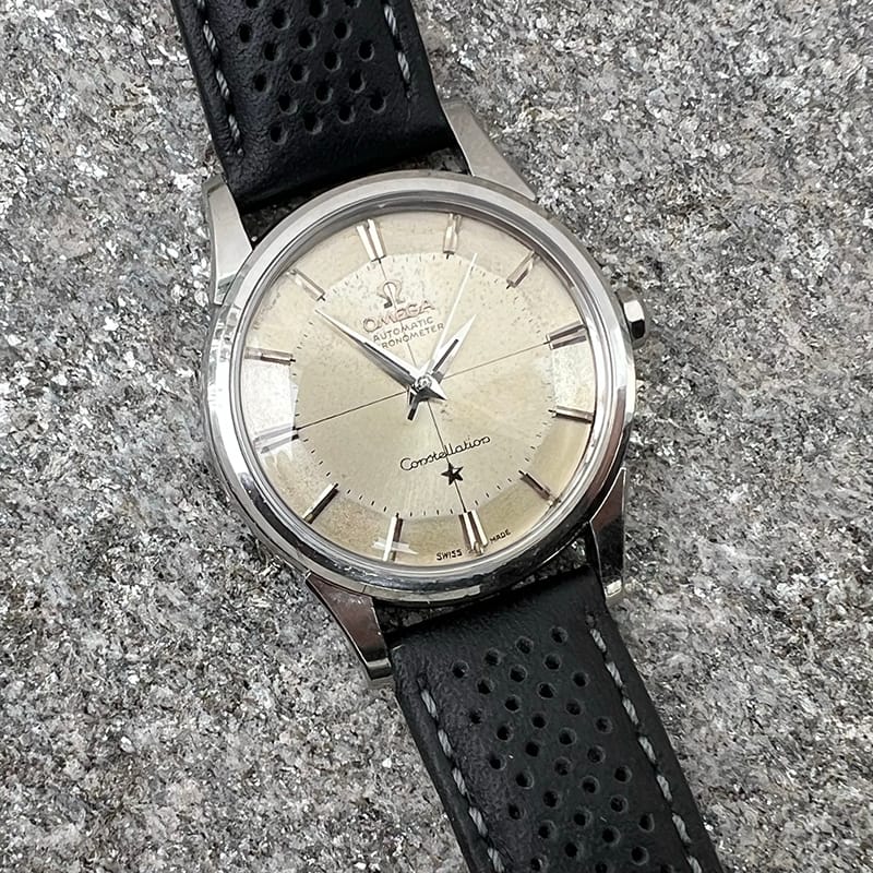 Steel Omega “pie pan” Constellations are very much sought after. This early “Automatic Chronometer”, ca 1960 version has a patinated dial, but is never the less a very attractive vintage watch. Wearing this watch on the wrist the dial seems fine and it is a real beauty. The hands and the crystal have now been replaced with original spare parts from Omega to further brighten the image of this super vintage watch. The combination of silvered dial, white gold hour indexes and steel hands is rarer than what is mostly found. Very often, the vintage Constellation setup consists of yellow gold dial details on a steel or gold on steel case. Most Constellations also sports a date window. The caliber 551, serial number 1826409 movement has been fully serviced.