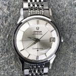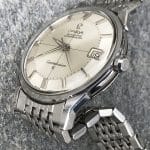 Our view is that it is very rare to find this complete Omega Constellation combination; a doglegged, steel cased, perfect silver dialed piepan, white gold hour markers, stainless steel bor (beads of rice) bracelet, and with box and papers.