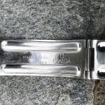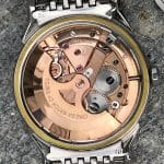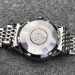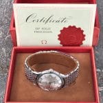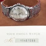 This is the best “Connie” we have seen. It comes with it’s original Constellation box, bill of sales and chronometer certificate with matching numbers. It is in mint condition throughout with the original, attractive and very desirable beads of rice Omega bracelet number 1503, end links stamped 70. The case reference includes the year of production (1962): 14902 62 SC and the stamp of the case manufacturer CB (Le Central Boîtes). Serial number on movement is 19491283. Diameter without crown is 34mm.