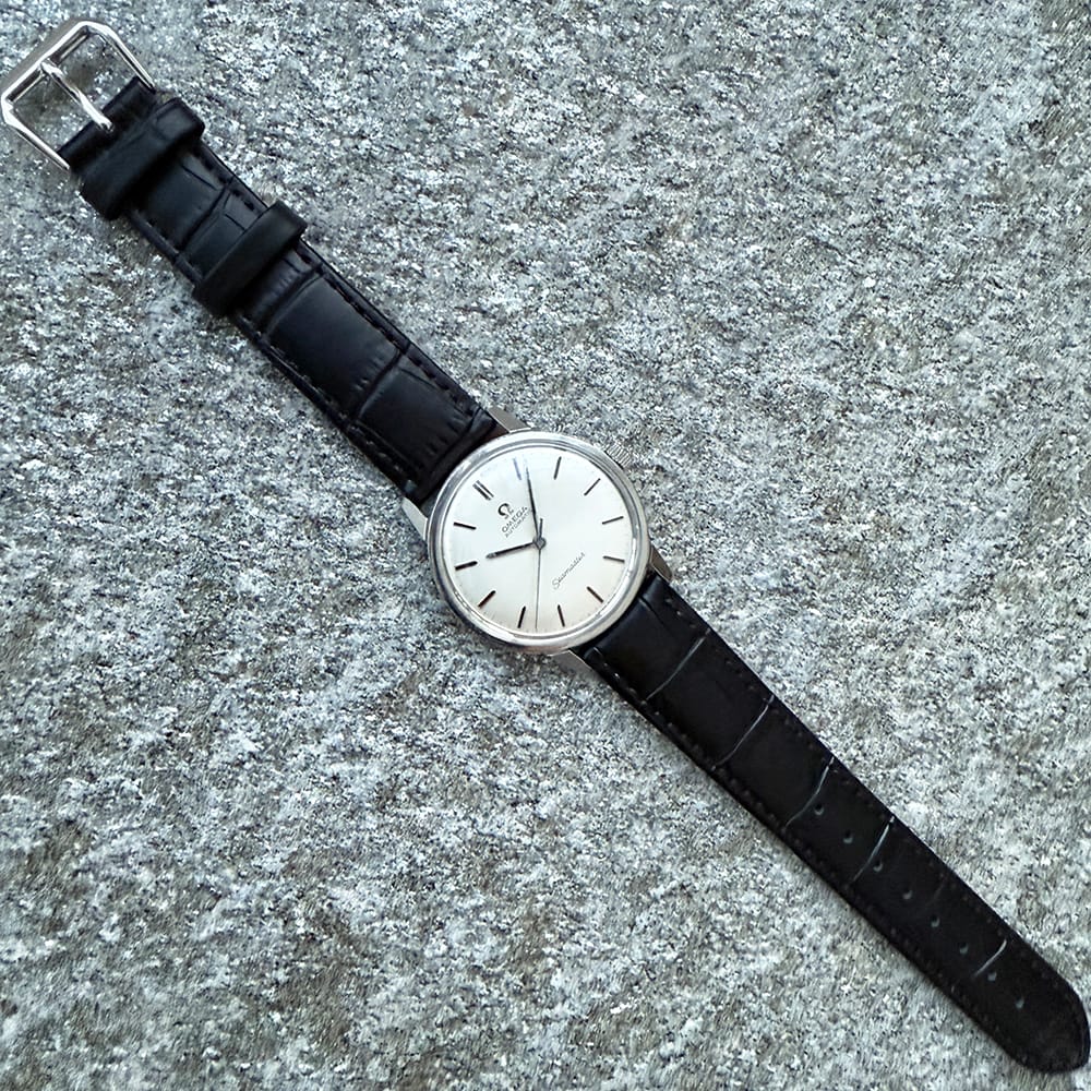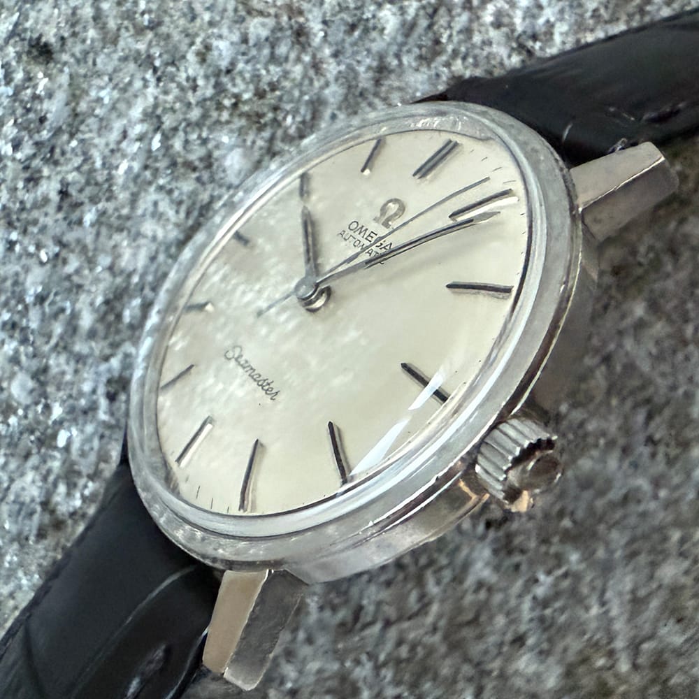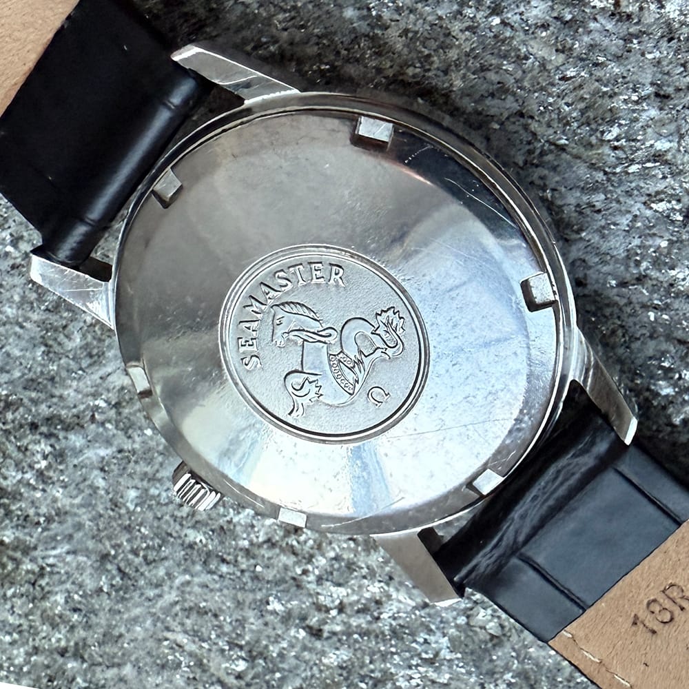 This well kept vintage Seamaster has a lot going for it: A silvered uncluttered dial, white gold baton applied hour markers heightened with black onyx and the super “hippocampus” Seamaster emblem on the caseback. That also includes the signed Omega crystal and the logo crown . The caliber 552 automatic movement has been fully serviced. The serial number is 22993704, dating this marvelous vintage to 1965. The unpolished 34,5 mm, stainless steel case has some marks, but this is a rare vintage Seamaster model in very good condition.