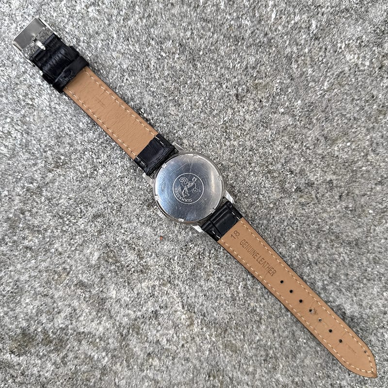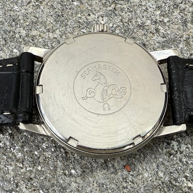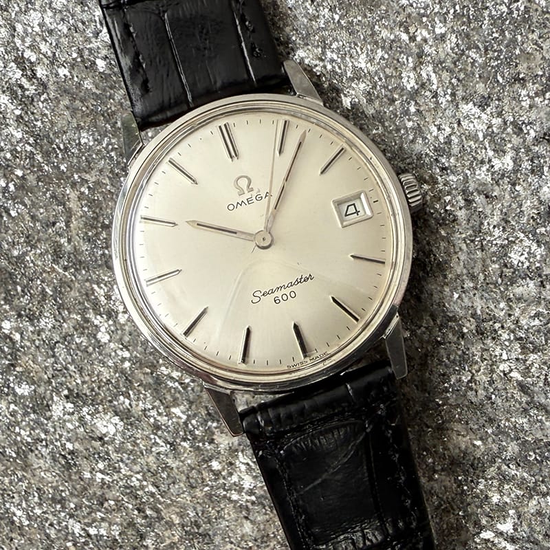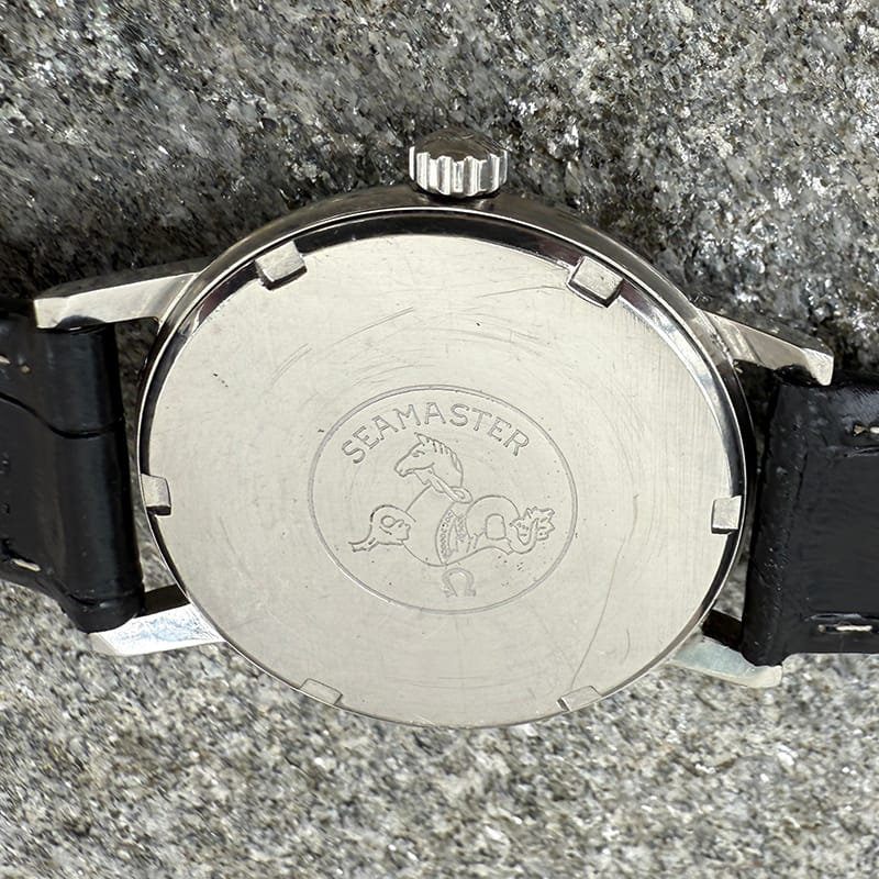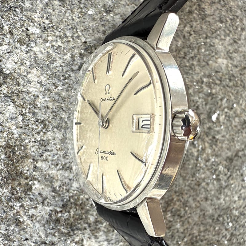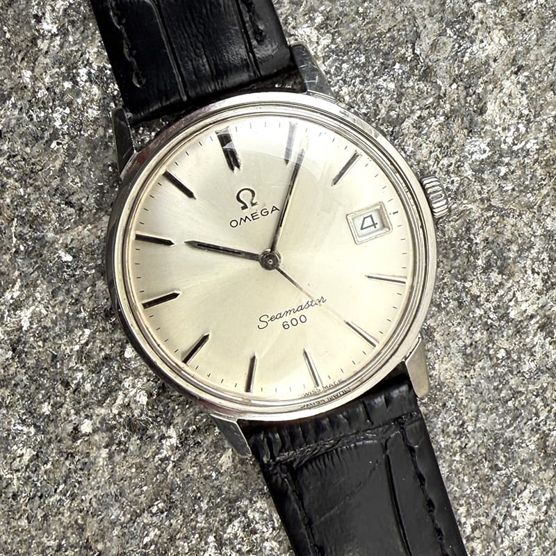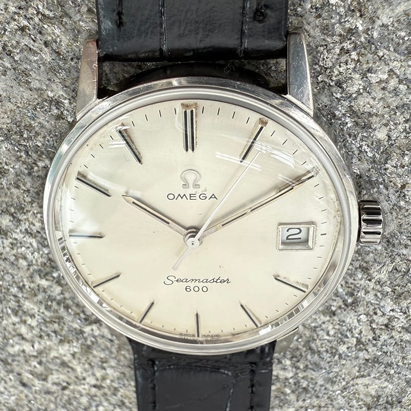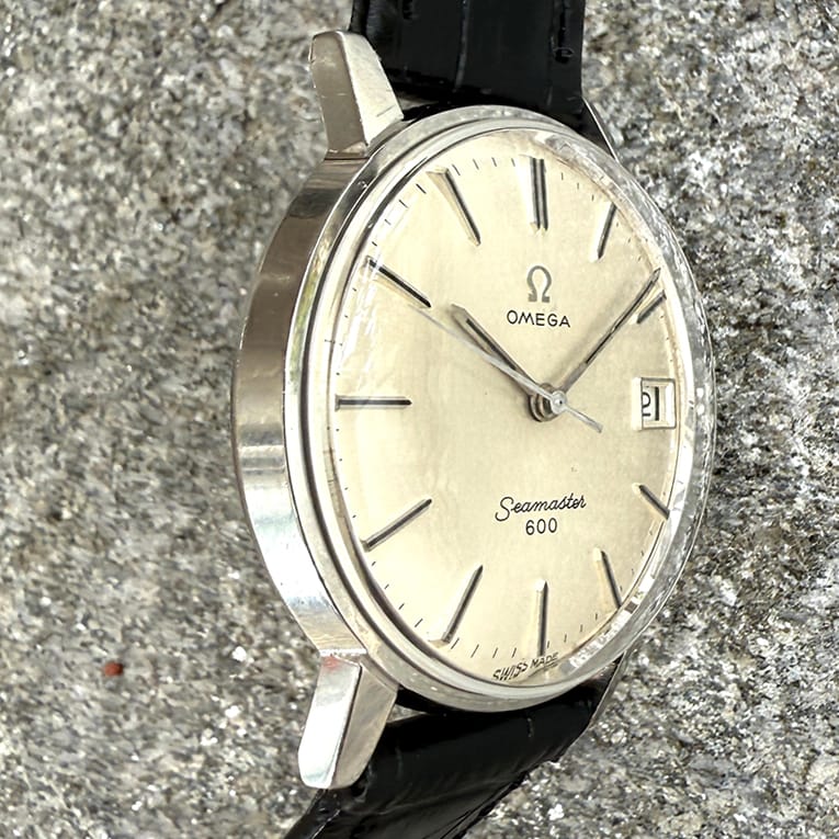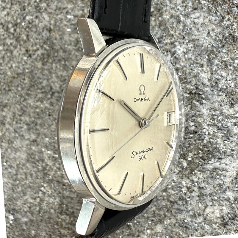 The black inserts in the white gold applied hour markers, and the steel hands filled with black lines adds a true elegance to the silvered dial of this Seamaster 600. The silvered dial has some small imperfections, but these are hardly visible. Most Omegas from this period come with luminous material, and many “no date” versions measure only 32,5 mm. Our opinion is that the significance of “No lume” is that the dial will keep longer, as most lume tends to degrade as years go by. The “600” on the dial signifies that Omega had changed from the earlier manual movements to the new caliber 600-series, it does not mean depth clearance in feet or meters! By the way, as with all vintage watches we point out that “Waterproof” does not apply now. Although this particular Seamaster has passed the watchmaker´s pressure test for water resistance to 30 m; Do not risk exposing your vintage watch to water! As for the manual movement, here you find the slightly modified caliber 611, with serial number 22300385, dating it to ca 1966. The movement is fully serviced, and the crystal has been changed to Omega original, sporting the Omega logo which you can see with a loupe in the dead centre of the glass. The lug width is 18, and the lug tip to lug tip is 39,6, the thickness is 10,2 mm. If you prefer another brand new strap, we will exchange it for free. Just email us to ask for a photo of our selection of (black) straps.