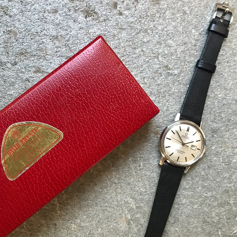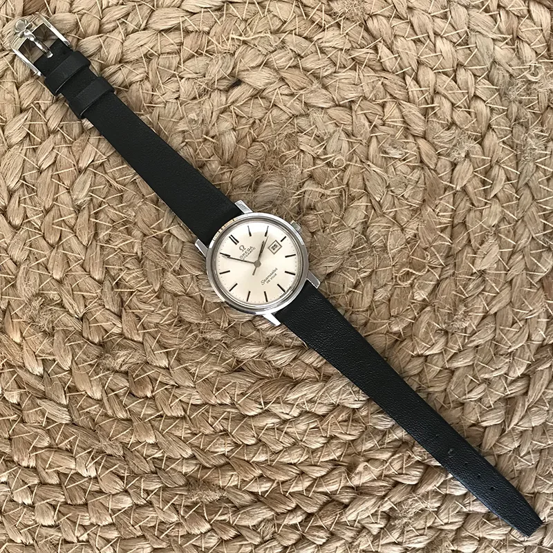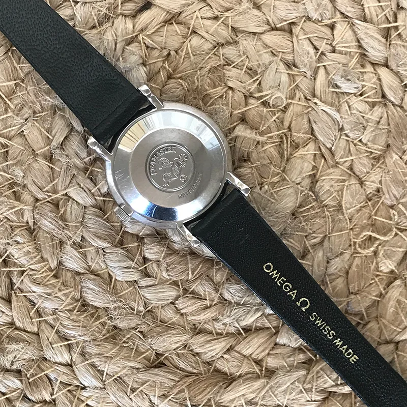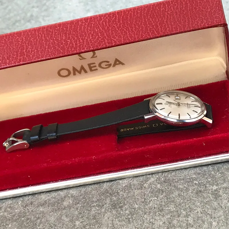 Never seen by us before, we are thrilled to offer this mint 28mm automatic. The vintage Omega comes with it’s original box, labelled by the watchmaker who sold it. The dial and hands are of the “no lume” category, thereby assuring no lume degradation over time. This is a vintage watch that will keep it’s appearance with careful use the next generation or two. We have equipped it with an NOS vintage Omega strap and buckle to complete the package. The combination of mint condition, box and new correct strap makes it an exceptionally nice gift package! It runs very well, and keeps charge, so that this Seamaster DeVille can be an everyday watch for the thin wrist. The monocoque case has not been opened by us, but we are offering it with 12 months guarantee, seing that the movement measures so convincingly on the timegrapher. We date it to the mid sixties. A rare opportunity indeed!
