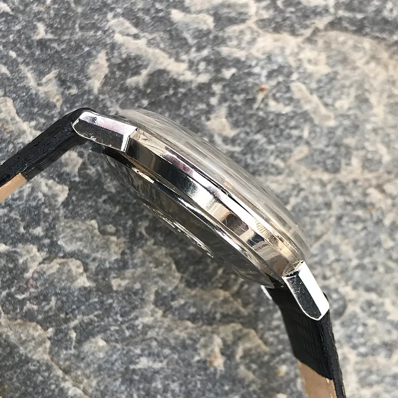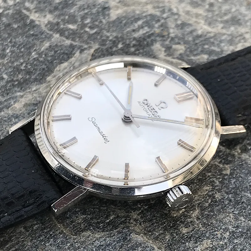 In addition to the two special features (more later) of this automatic Seamaster, it is cased in a Seamaster DeVille monocoque steel case. The Seamasters from the sixties, like this one, rarely come with the combination of a no date automatic, and it is even rarer to find the OMEGA name applied in white gold on the dial. Standard on the Constellations only, it ads exclusivity to this example of clean watch design. Unfortunately it is not in mint condition all over, mainly because some lume is missing from the hands, (the crystal and crown have also been replaced at one time), but non the less a super vintage Omega with the favorite material combination: silver dial with white gold indexes. A fully serviced watch (September 2020), it carries a 12 month watchmaker´s warranty. Case diameter 34mm, dating from ca 1965.