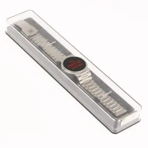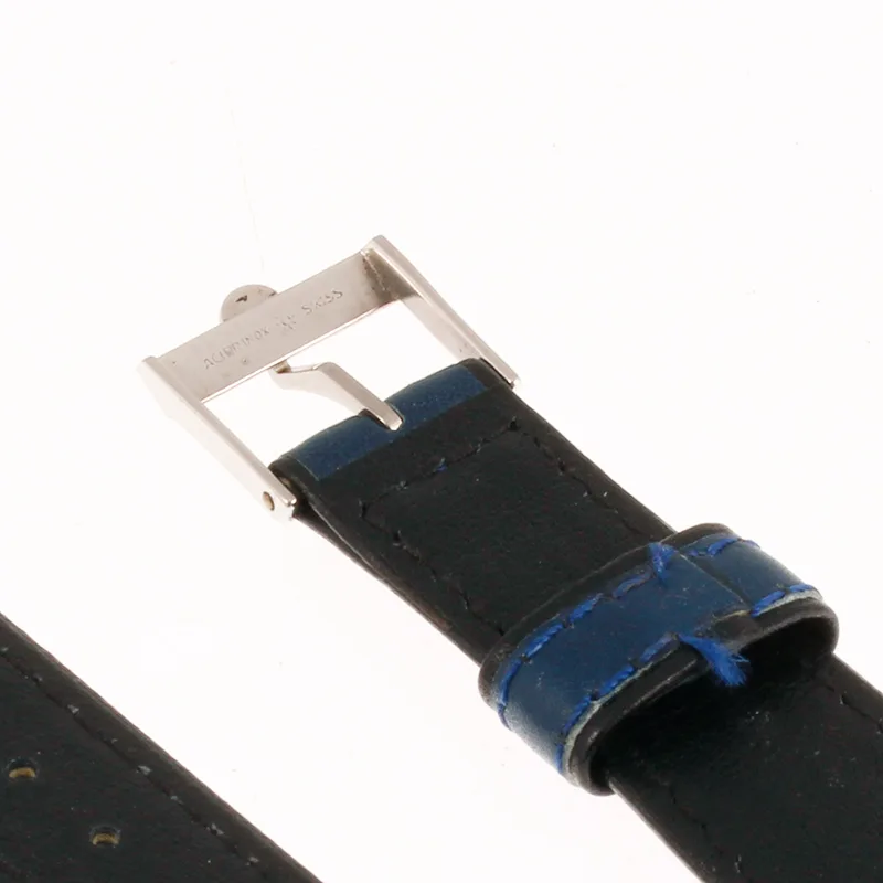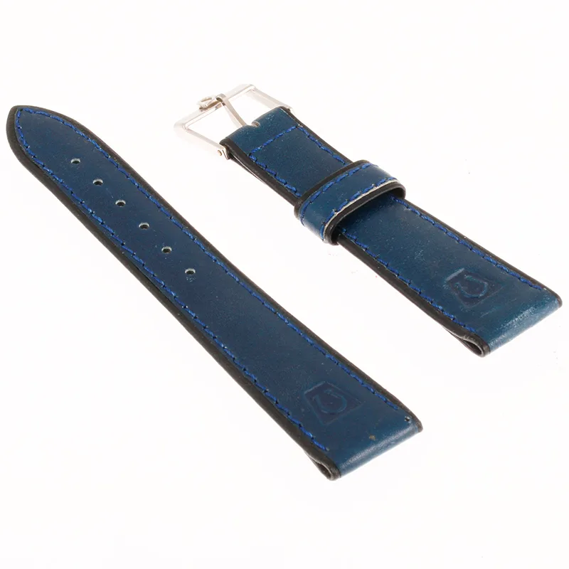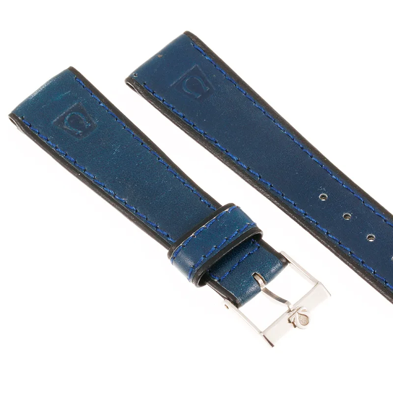 NOS vintage blue strap 20 mm lug width, 20 cm long, with a 16 mm stainless steel Omega buckle. Omega logo embossed on both parts, “Omega, Swiss Made” on the reverse.