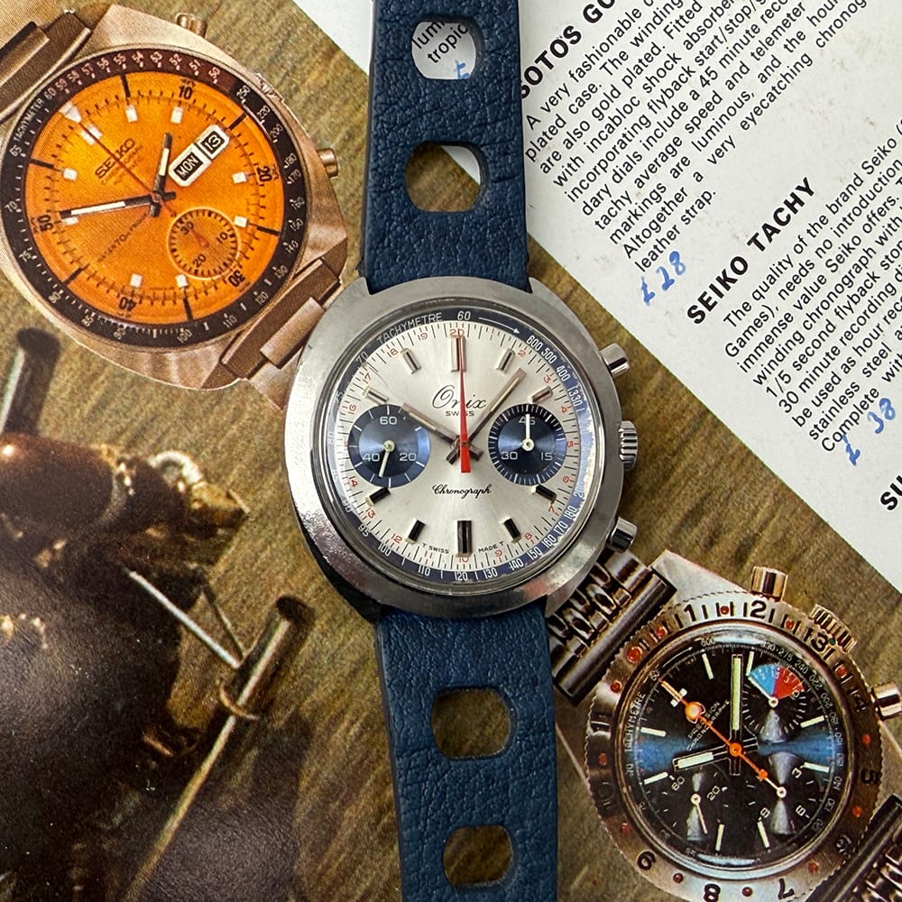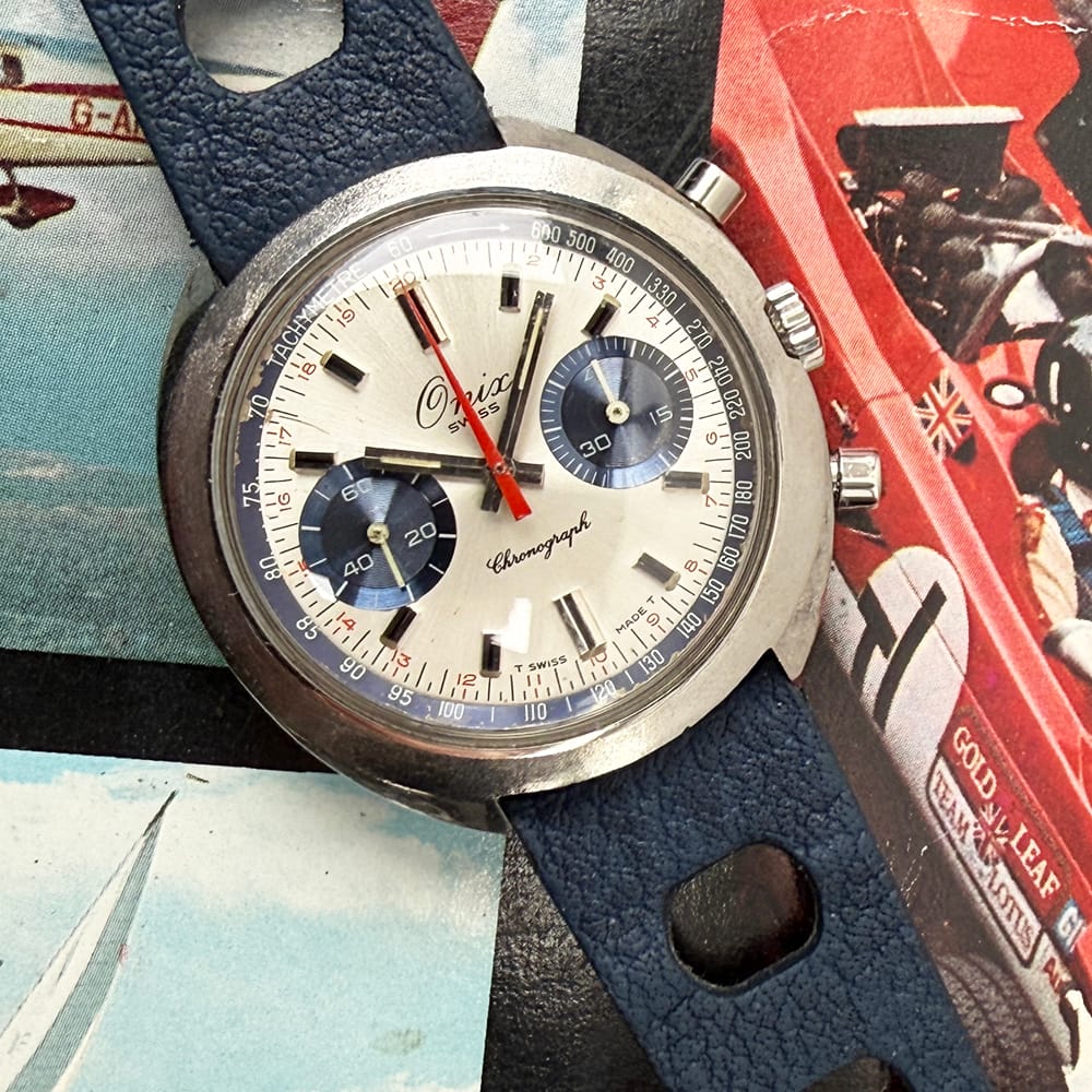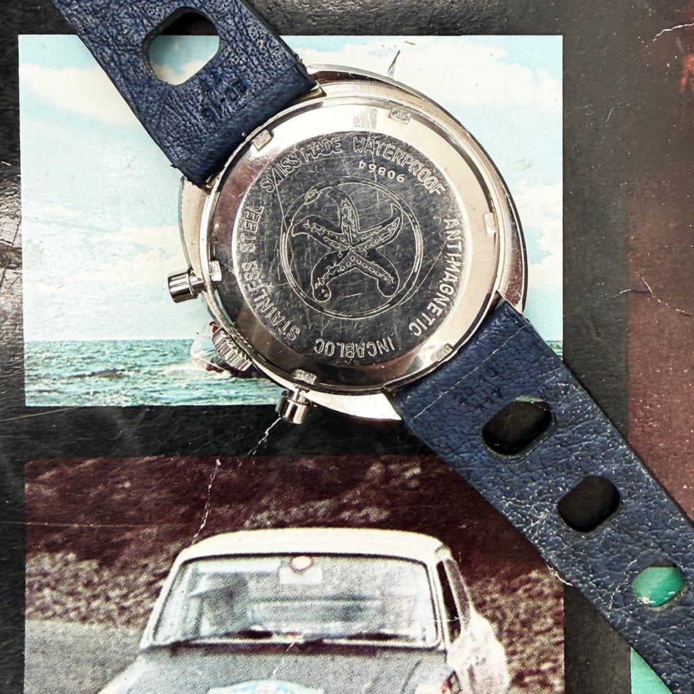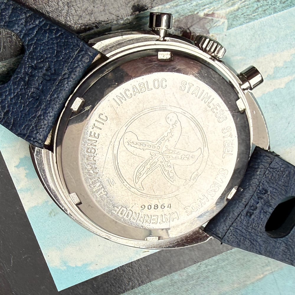Stainless steel chronograph with mint, high quality industry standard Valjoux 7733 movement. Telemeter (red) and tachymeter base 1000 (blue) scales. Intact lume on dial and hands. Applied hour markers and sunken blue subdials demonstrates very high quality dial. Back numbered 90864 labelled “Antimagnetic”, “Waterproof” (the term was replaced with “waterresistant” in the early 1970’s)and “Swiss Made”. Slight patination on inside Tachymeter scale. Hairline on dial between 10 and 11. A version of a chronograph some would call a “poor man’s Heuer”. 39.5 diameter, thickness 12.9 mm and lug width 19 mm. Choice of straps.
