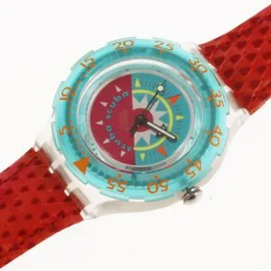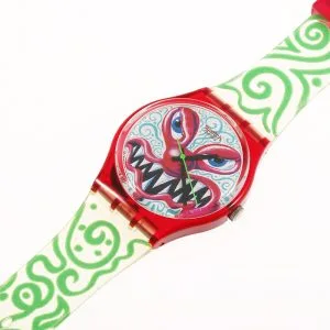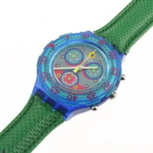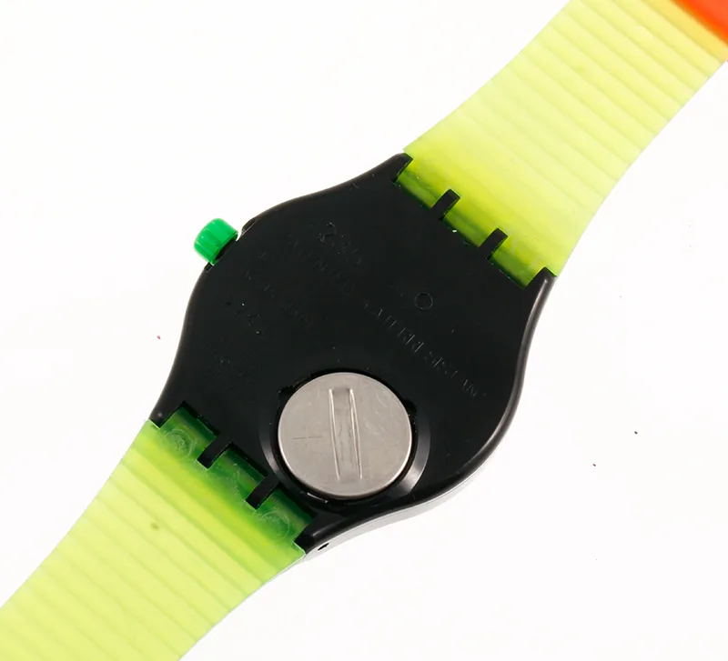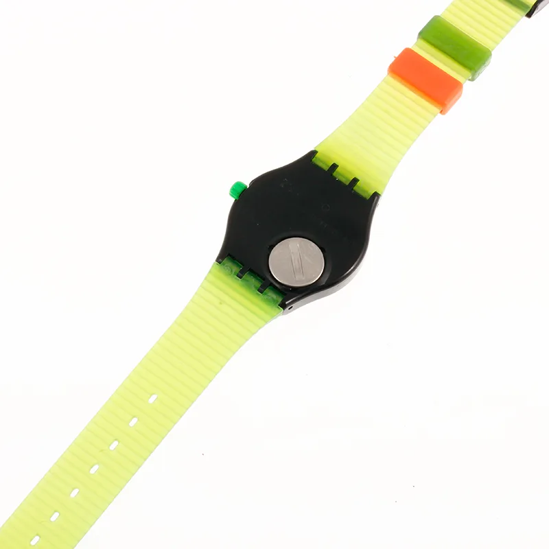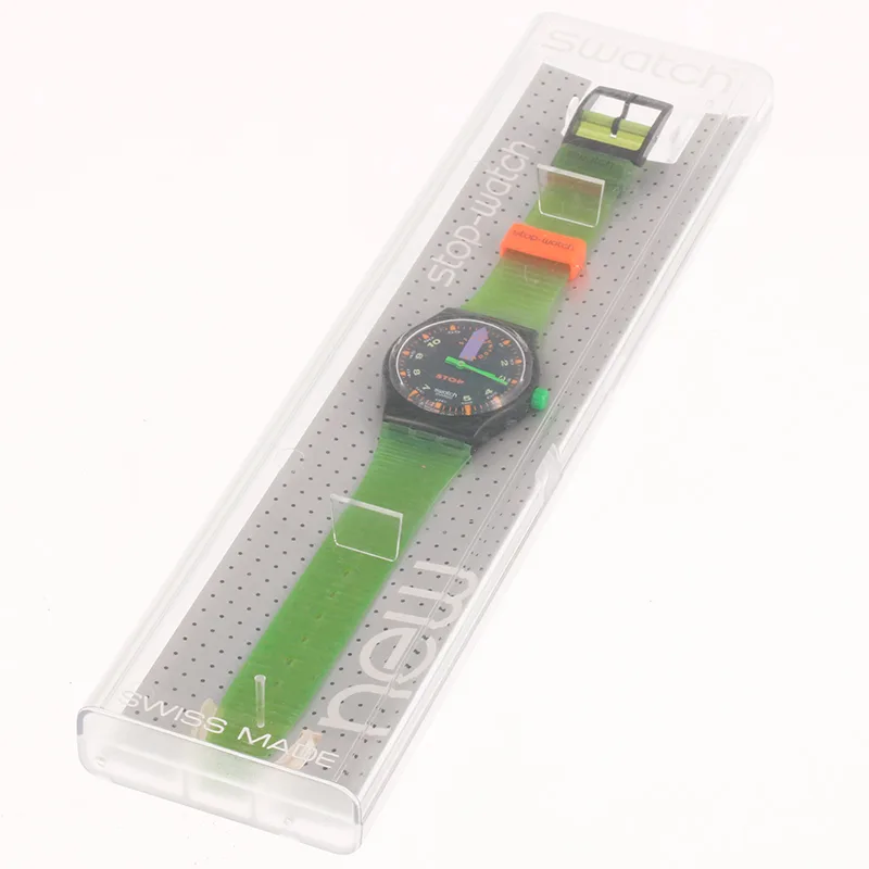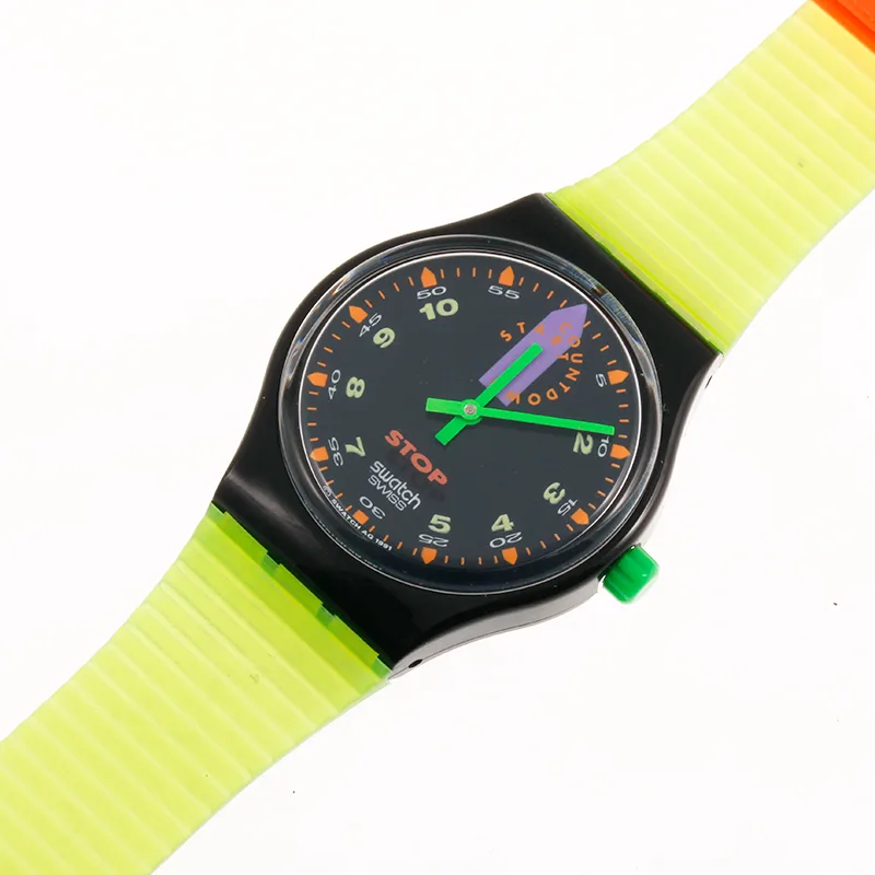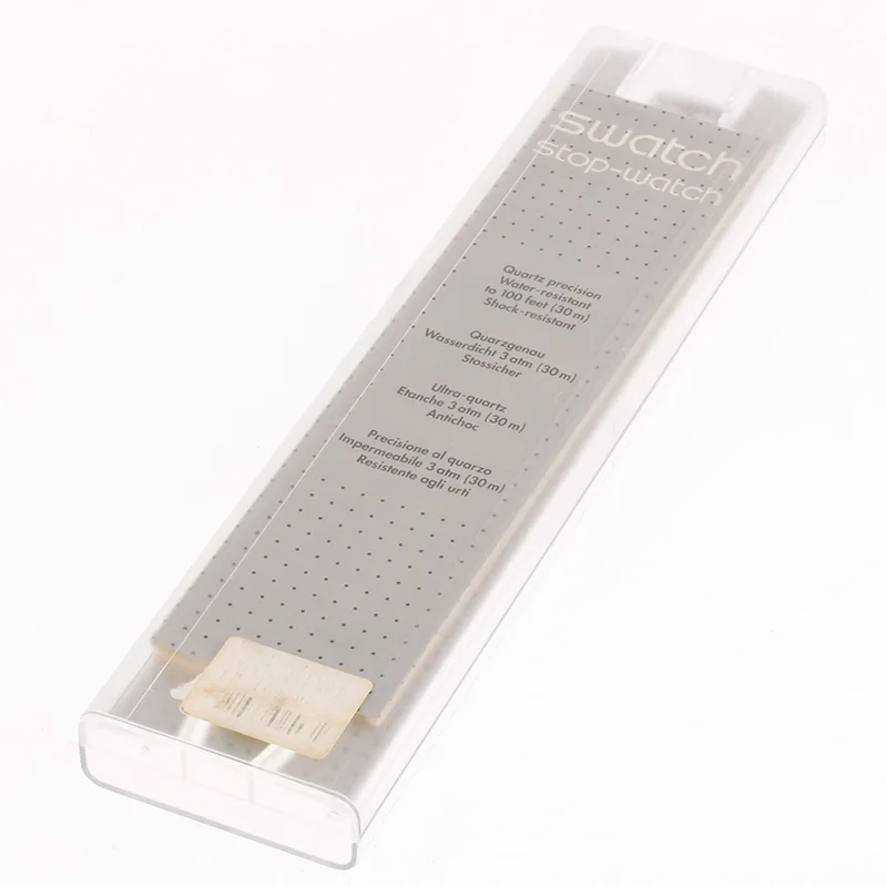 In reality this is a single button chronograph (counting seconds only though), and great fun! The plastic strap retainers reads “swatch” and “stop-watch”, confirming that this example has its original band. The crystal has “STOP” engraved, and both the two hands (there is no ordinary seconds hand here) and the crown (!) have luminecent material. The diameter of the black case is 34 mm and it has the stamps 235/5742. The dial is marked “©SWATCH AG 1991”. Complete and mint, the instruction booklet included explains how to use the stop-watch function. New battery fitted when shipped.