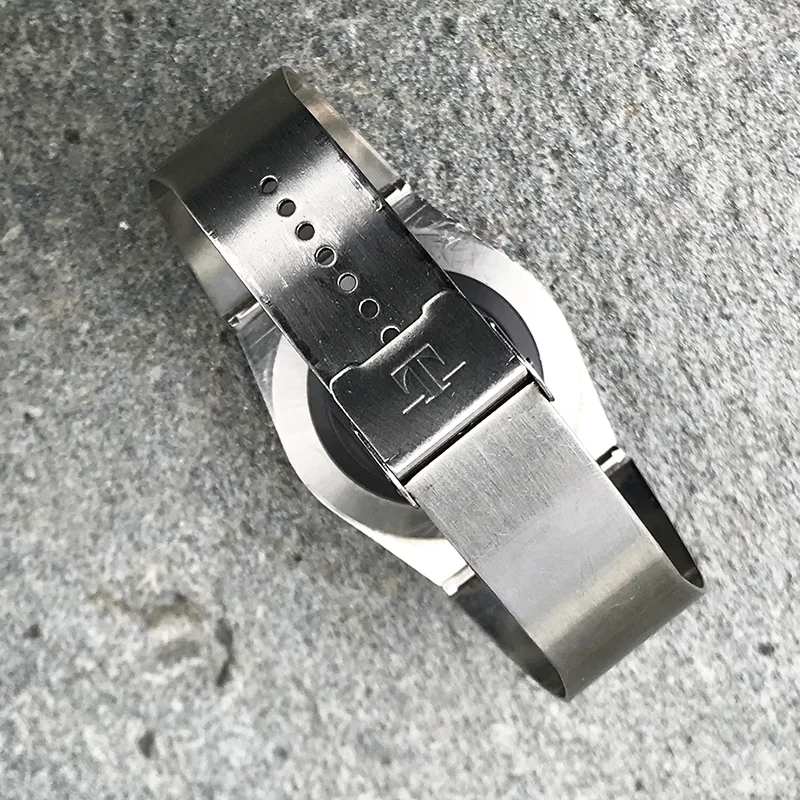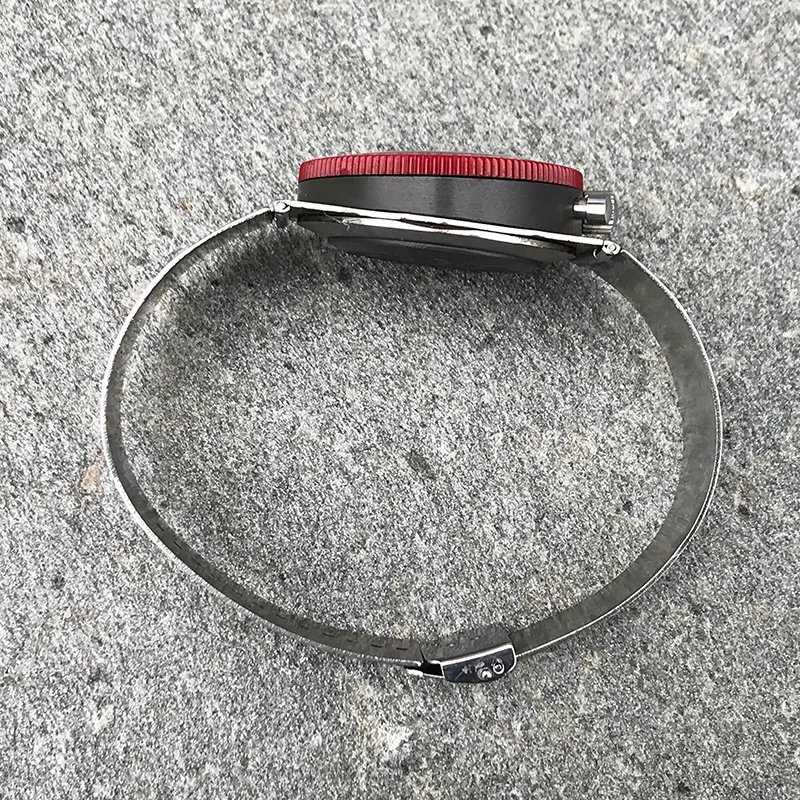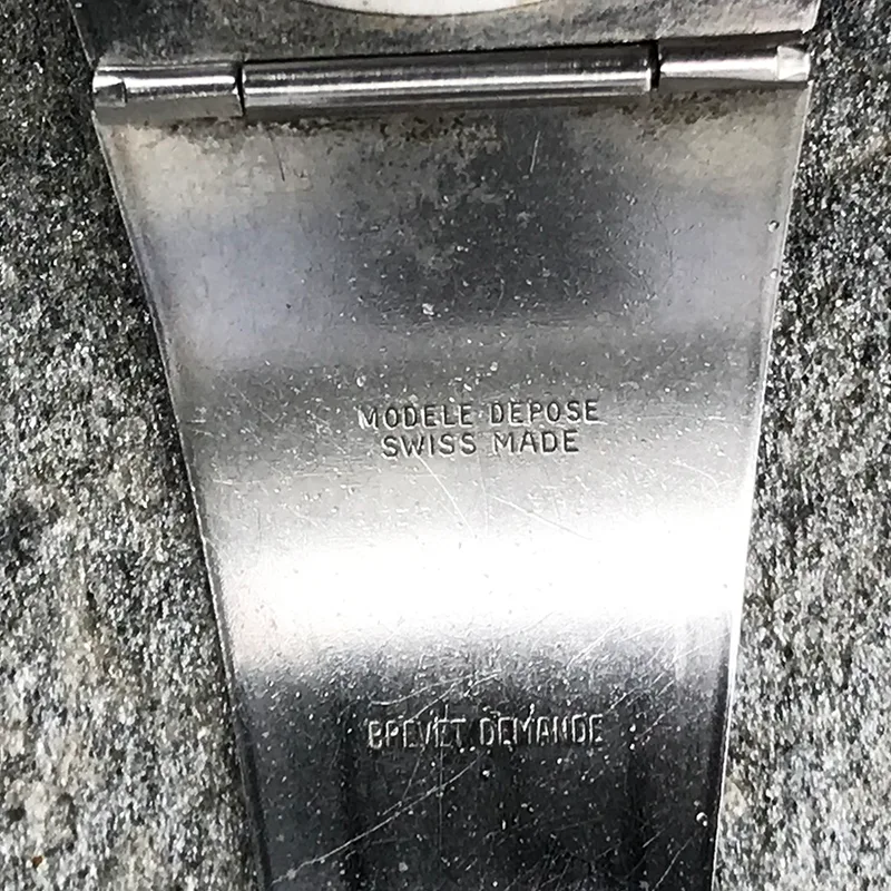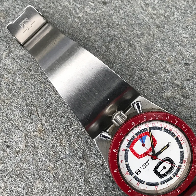 You have to study the pictures to see this watch! It really has many surprising features for a vintage watch from ca 1970. Basically a timer (chronograph/stop watch) that is fixed to a stiff steel bracelet. Pushers at 12 o’clock justifies the term “bullhead”. And then the mysterious scaling of the outer part of the dial and the corresponding markings on the bezel!?